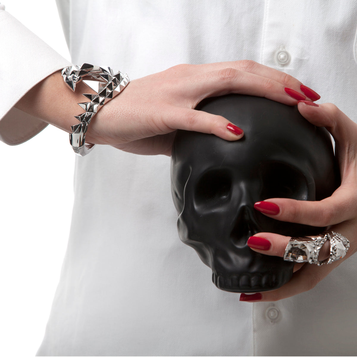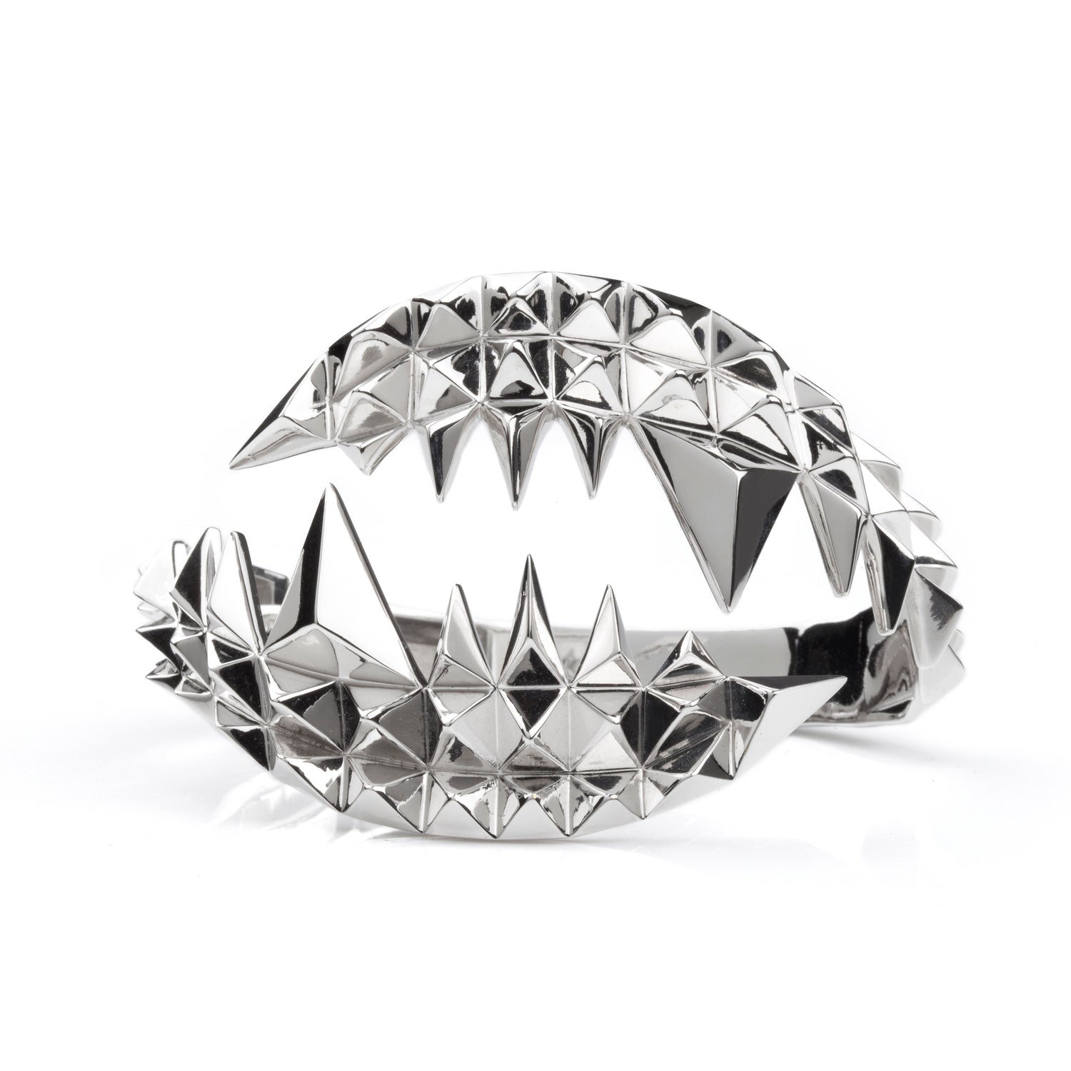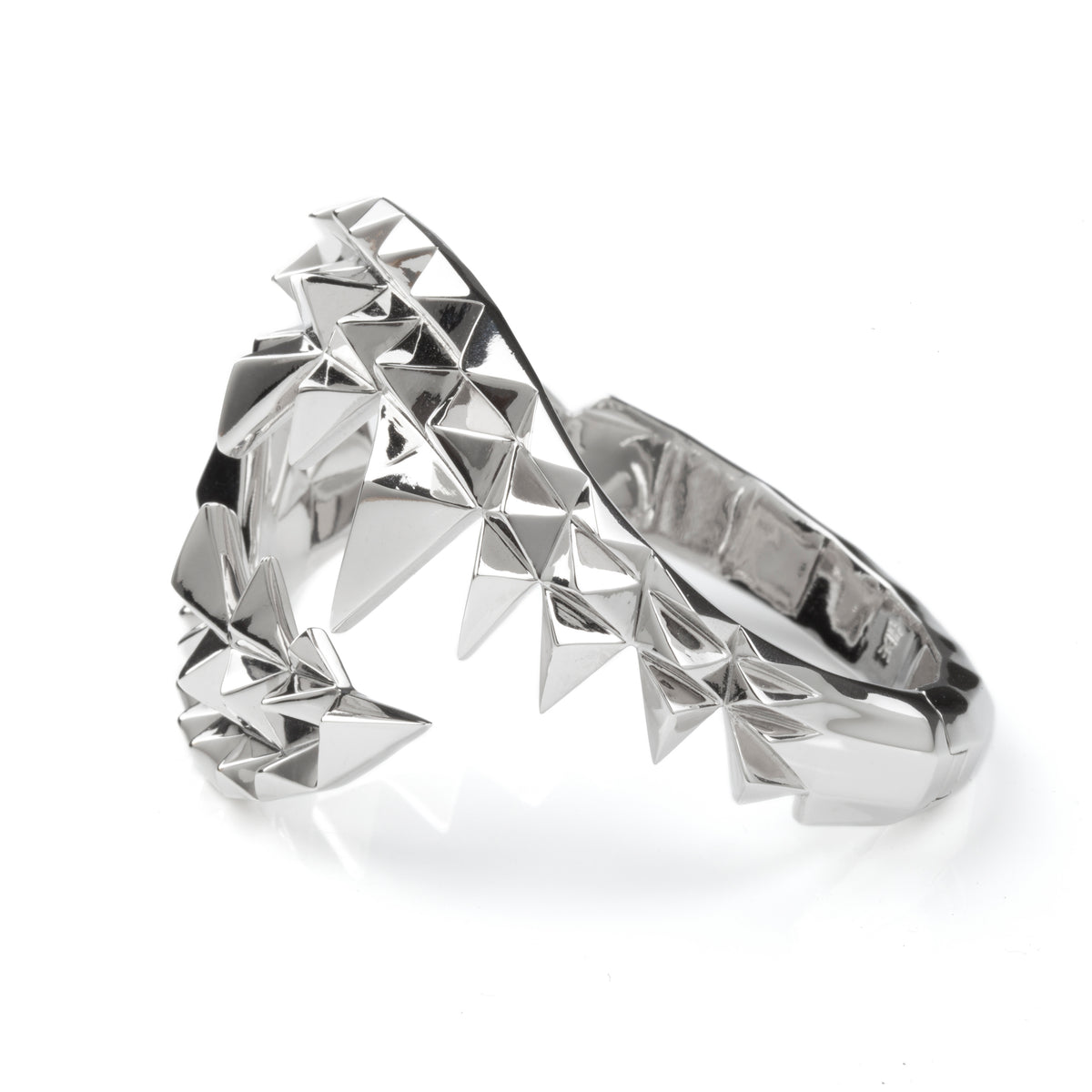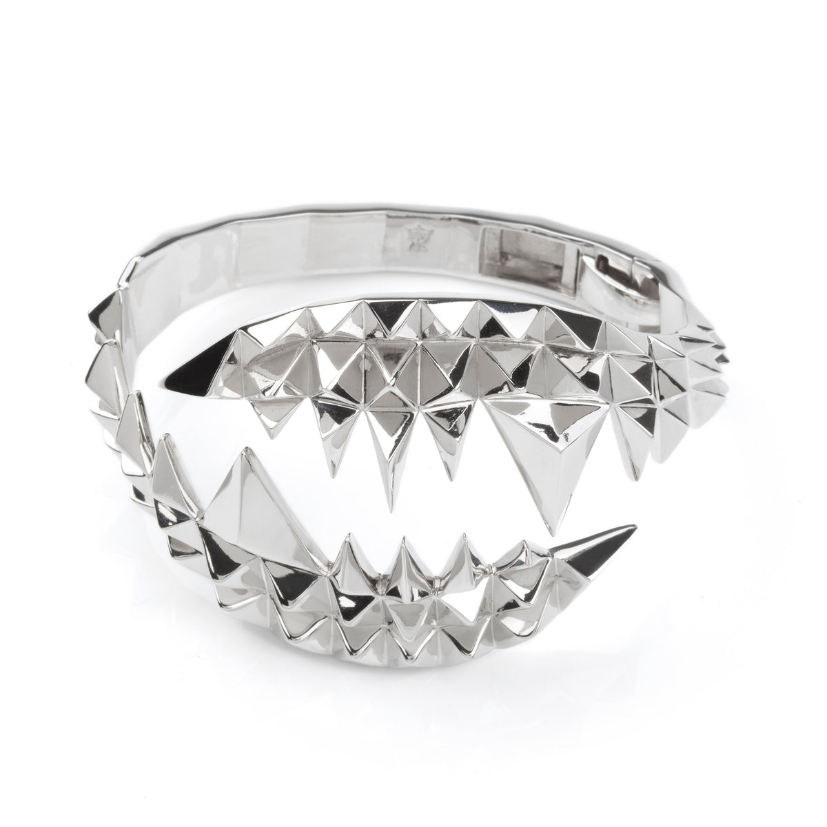 This Fang Bangle Silver by Kasun is not for the faint-hearted. It's a dramatic statement bangle that depicts the ferocious jaws of a crocodile. The geometric design brilliantly reflects light, drawing all eyes to it. With a concealed hinge, it's easy to put on, and its bold design adds a sense of mystery and ferocity to your style.