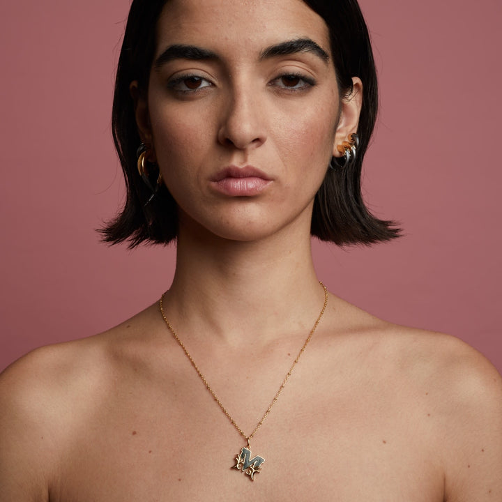 This pendant necklace is in the shape of an ampersand (&). It is available with mother of pearl or Italian marble embellishments and with silver/rhodium or silver/yellow gold plating. This specific piece is silver with green Italian marble.