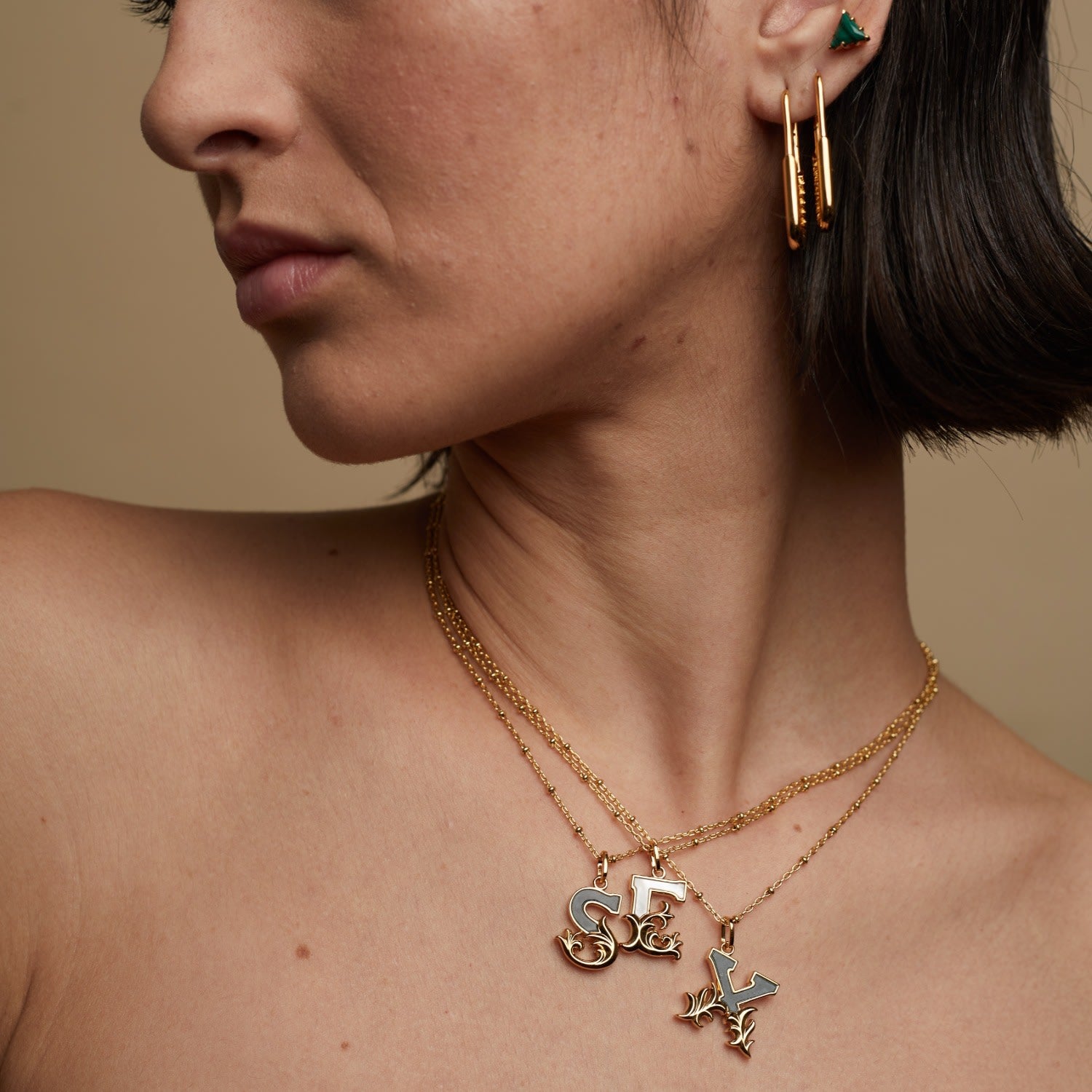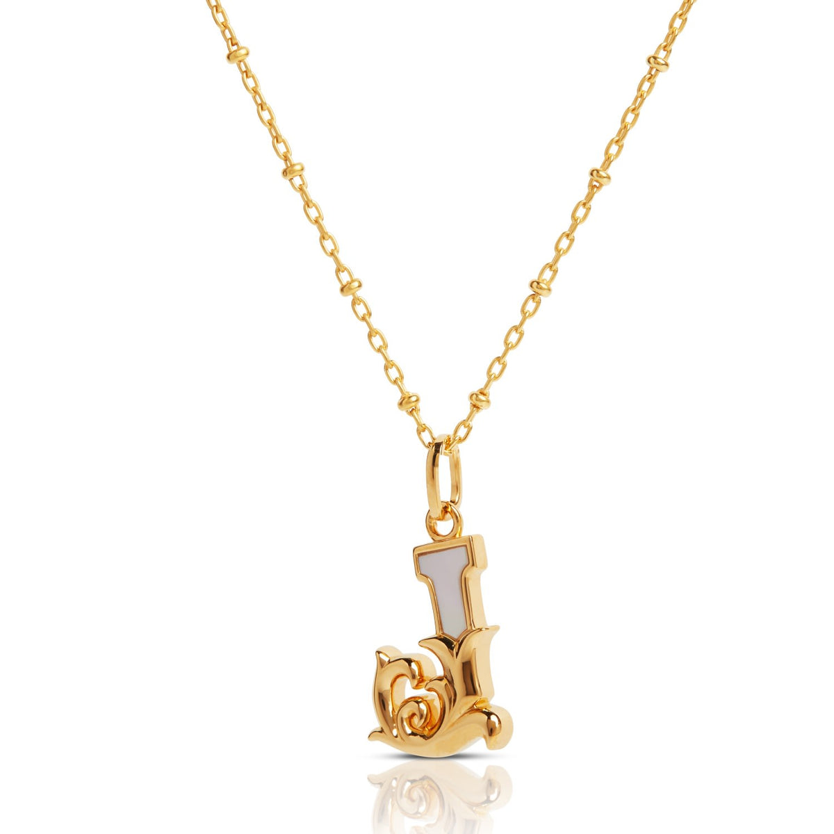 This Gold Plated J Initial Necklace With Mother Of Pearl by Kasun is a subtle way to personalize your jewelry. The pendant features the initial "J" with a mother of pearl embellishment, inspired by vintage advertising fonts. This necklace is designed to signify growth, change, and positivity, making it a great gift for yourself or for loved ones.