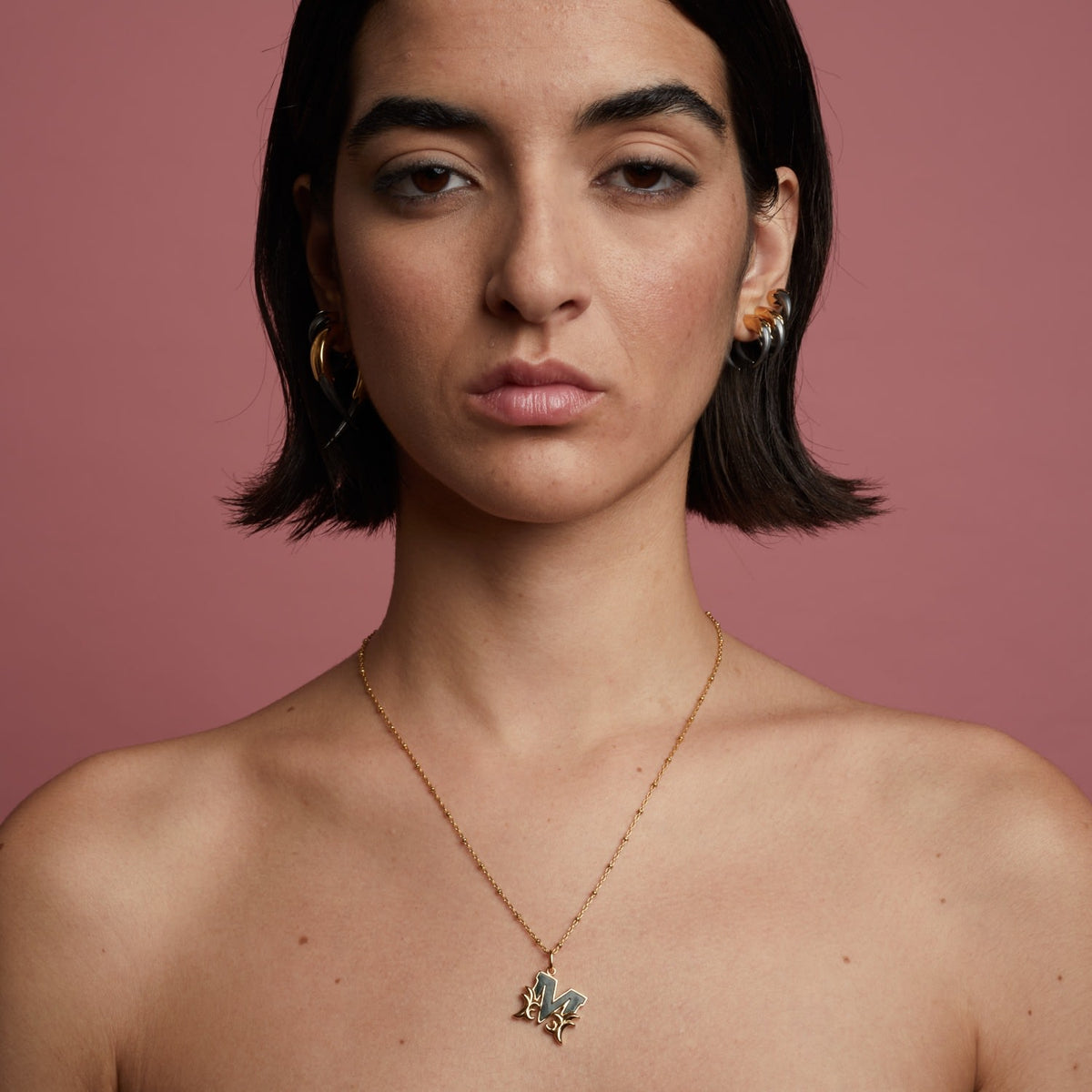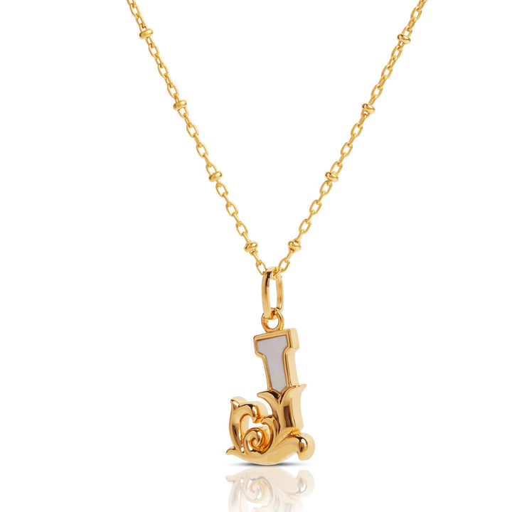 This pendant necklace features a "J" initial with a mother-of-pearl embellishment. It is gold plated over silver. It is also available with Italian Marble or in silver/Rhodium plating.