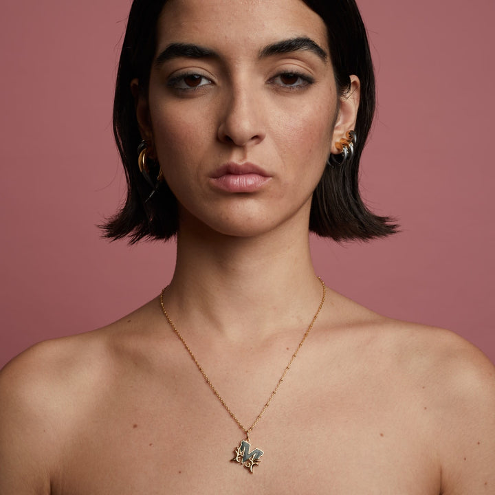 This pendant necklace features an "S" initial with a mother-of-pearl embellishment. It is gold plated over silver. It is also available with Italian Marble or in silver/Rhodium plating.