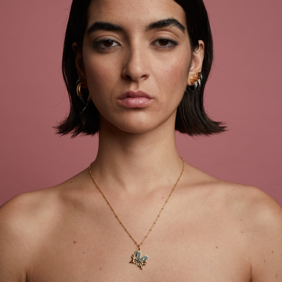 This pendant necklace features an "F" initial with a mother-of-pearl embellishment. It is gold plated over silver. It is also available with Italian Marble or in silver/Rhodium plating.