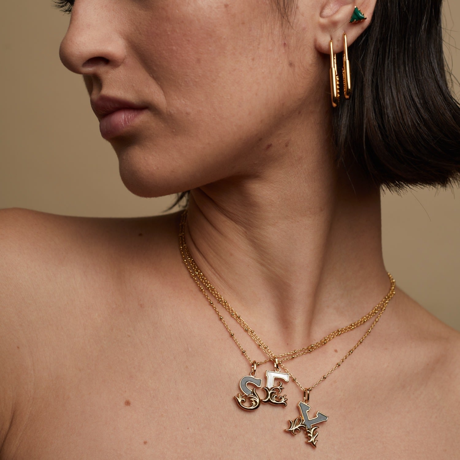This Gold Plated F Initial Necklace With Mother Of Pearl by Kasun is a subtle way to personalize your jewelry. The pendant features the initial "F" with a mother of pearl embellishment, inspired by vintage advertising fonts. This necklace is designed to signify growth, change, and positivity, making it a great gift for yourself or for loved ones.
