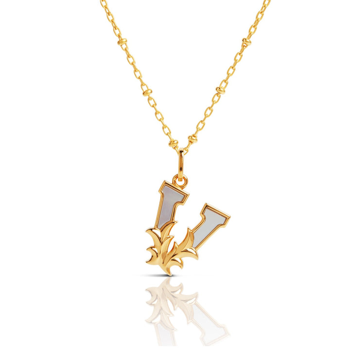 This pendant necklace features a "V" initial with a mother-of-pearl embellishment. It is gold plated over silver. It is also available with Italian Marble or in silver/Rhodium plating.