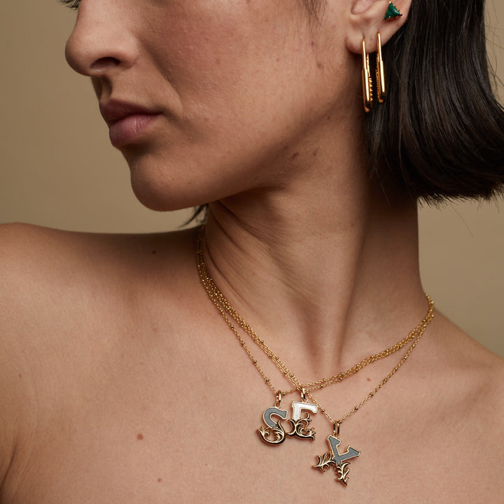 This Gold Plated V Initial Necklace With Mother Of Pearl by Kasun is a subtle way to personalize your jewelry. The pendant features the initial "V" with a mother of pearl embellishment, inspired by vintage advertising fonts. This necklace is designed to signify growth, change, and positivity, making it a great gift for yourself or for loved ones.