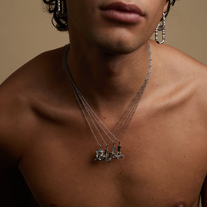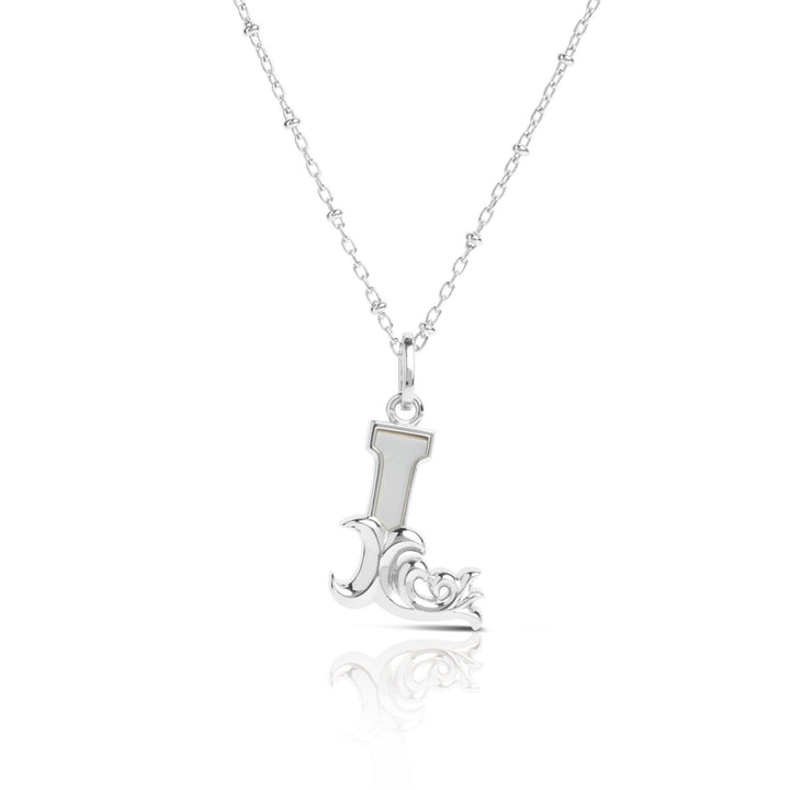 This Solid Silver L Initial Necklace With Mother Of Pearl by Kasun is a subtle way to personalize your jewelry. The pendant features the initial "L" with a mother of pearl embellishment, inspired by vintage advertising fonts. This necklace is designed to signify growth, change, and positivity, making it a great gift for yourself or for loved ones.