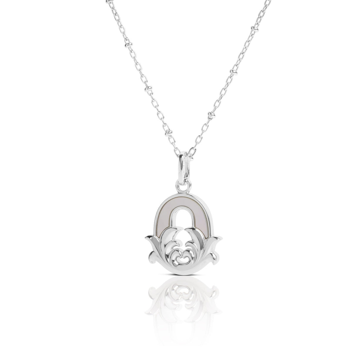 This pearl necklace features an "O" initial with a mother-of-pearl embellishment. It is made of solid silver with rhodium plating. It is also available with Italian Marble or in silver/yellow gold plating.