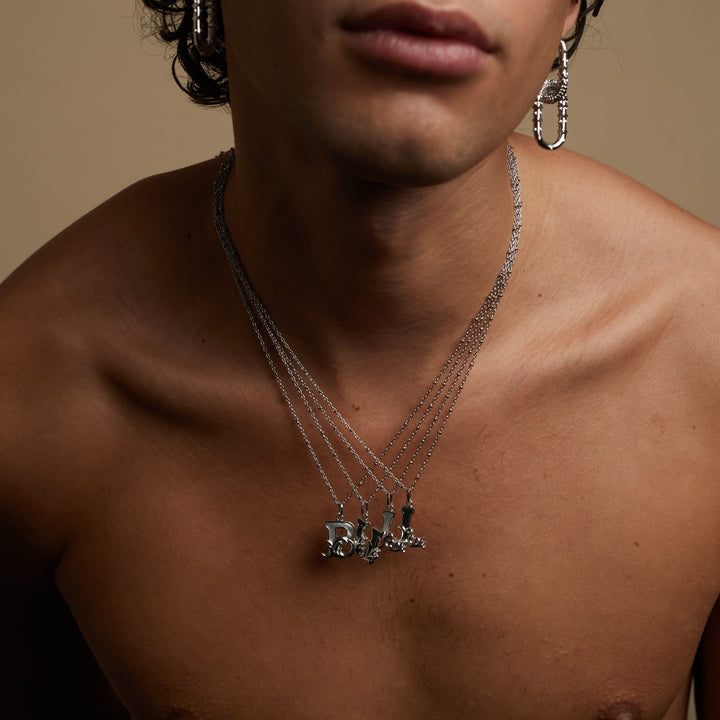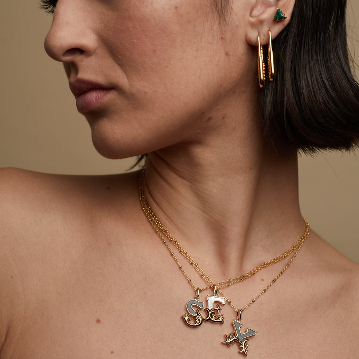 This Solid Silver T Initial Necklace With Mother Of Pearl by Kasun is a subtle way to personalize your jewelry. The pendant features the initial "T" with a mother of pearl embellishment, inspired by vintage advertising fonts. This necklace is designed to signify growth, change, and positivity, making it a great gift for yourself or for loved ones.