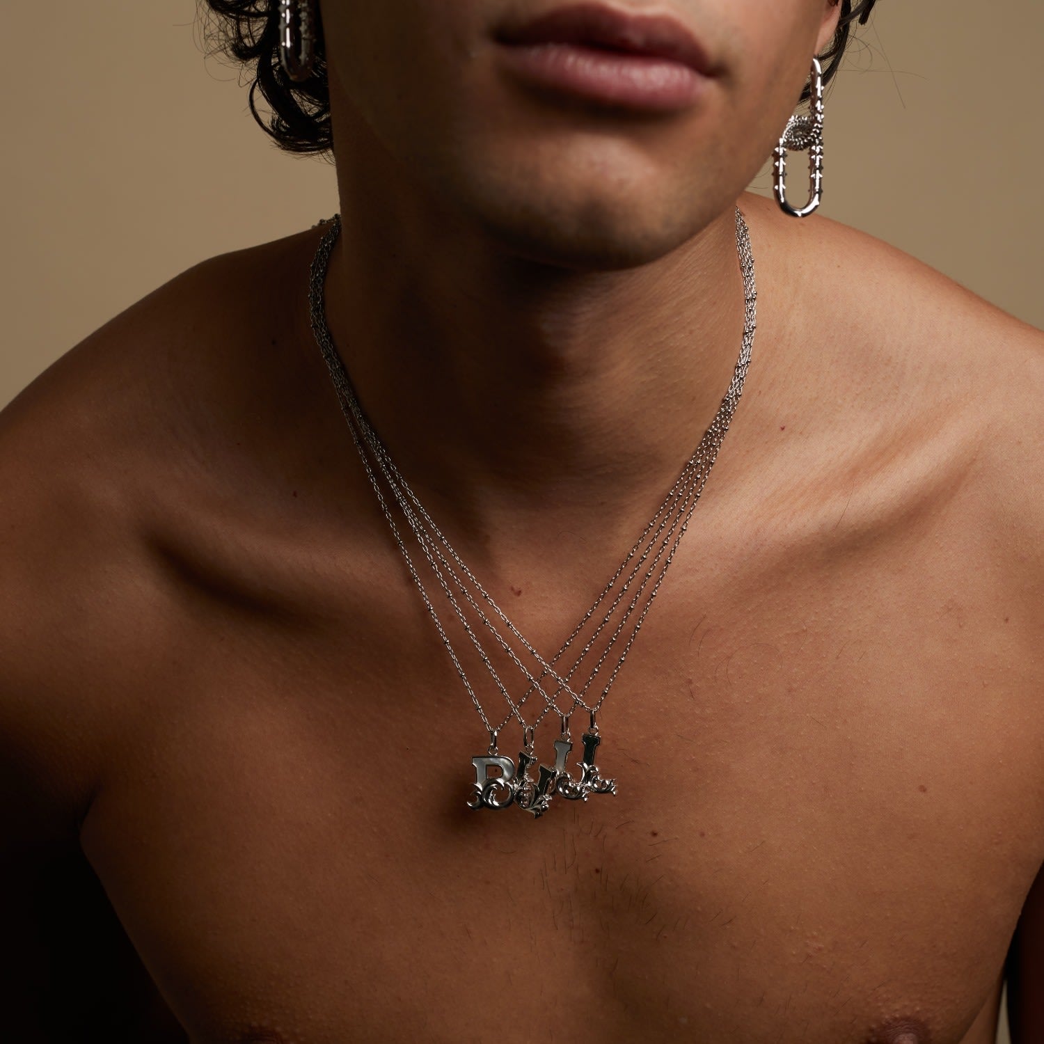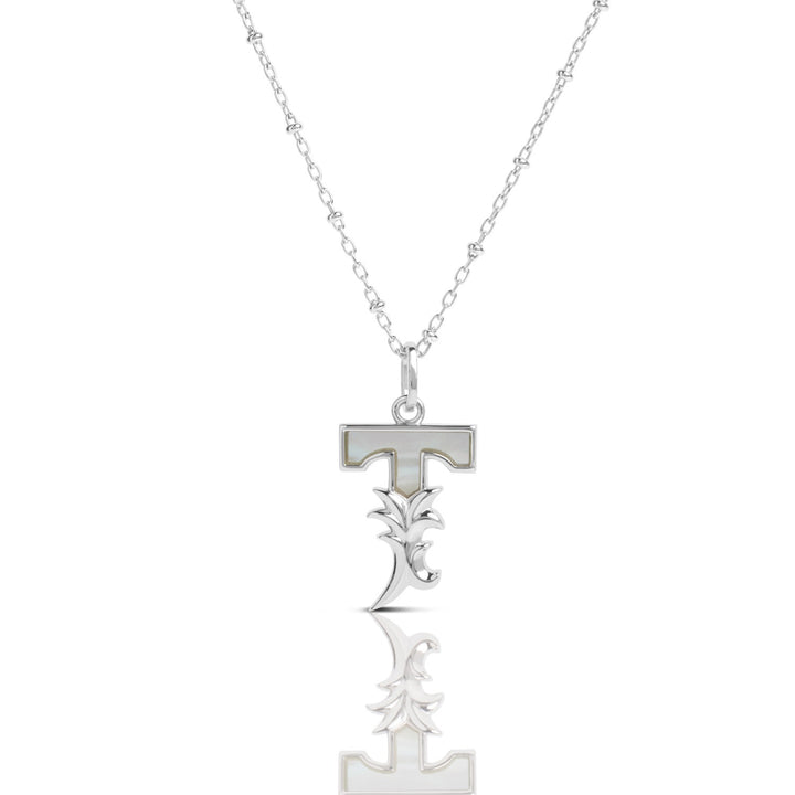 This pearl necklace features a "T" initial with a mother-of-pearl embellishment. It is made of solid silver with rhodium plating. It is also available with Italian Marble or in silver/yellow gold plating.