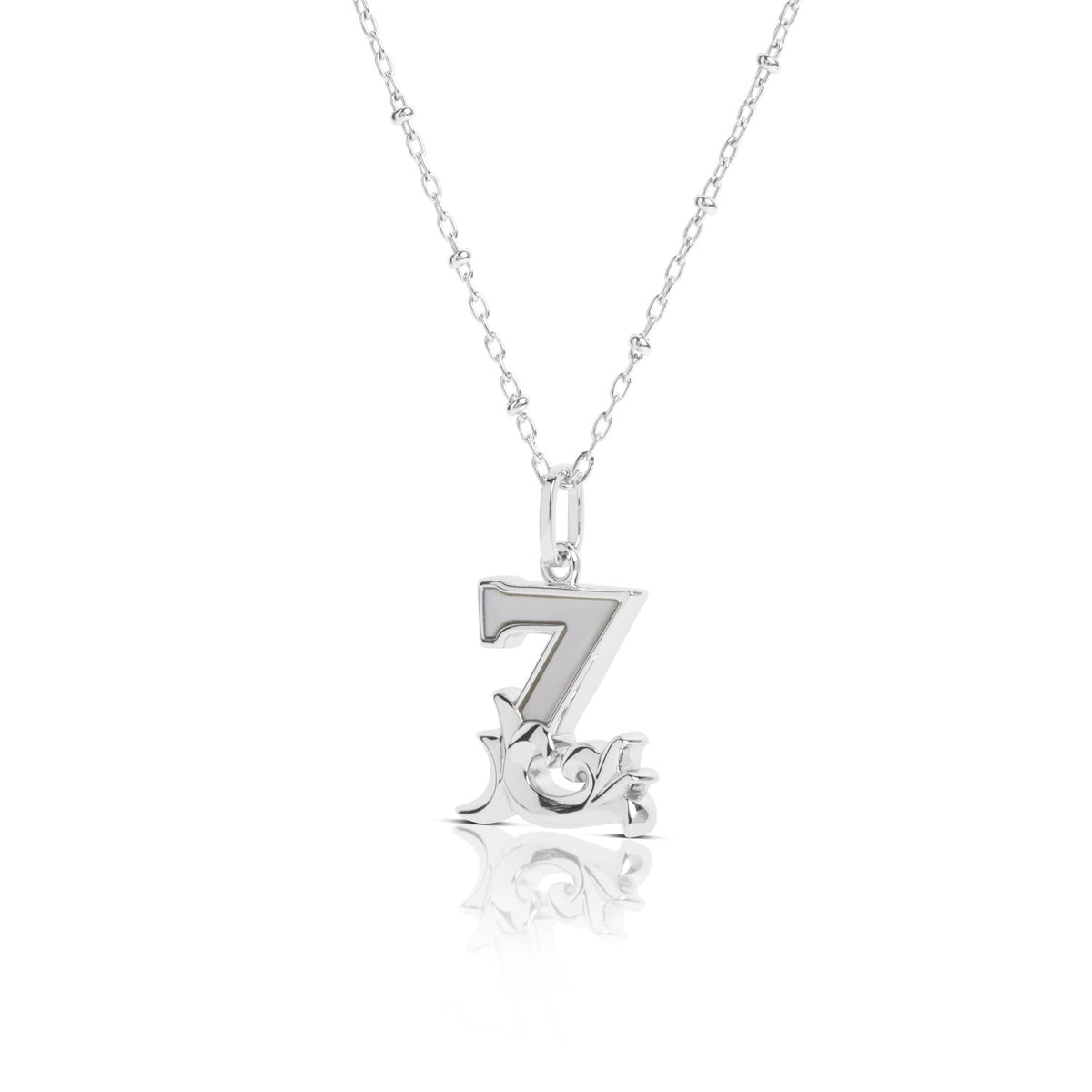 This pendant necklace features a "Z" initial with a mother-of-pearl embellishment. It is made of solid silver with rhodium plating.