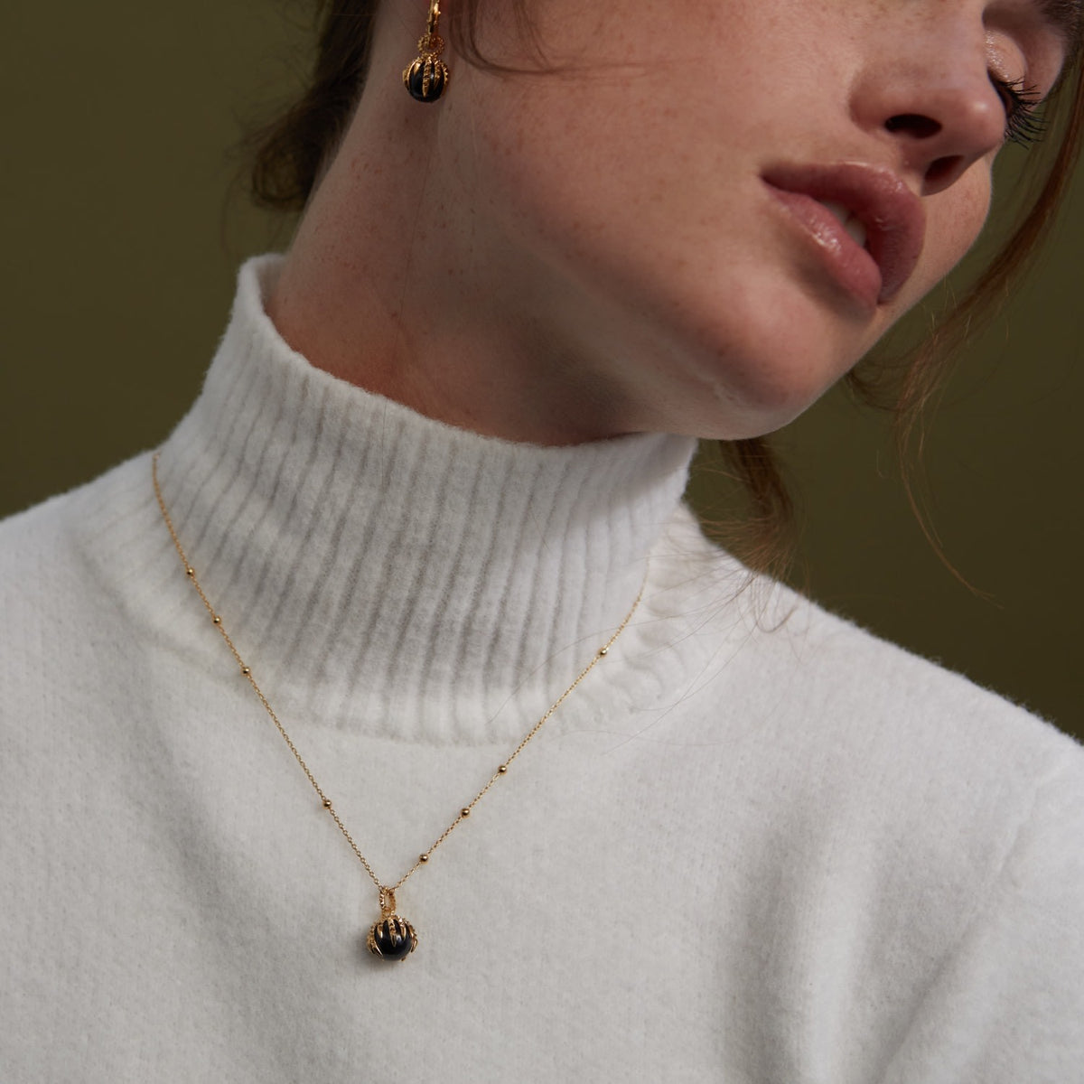 This The Pearl & The Dragon – Gold & Ivory Pearl Necklace by Kasun is inspired by the legend of Chinese folklore. The fierce dragon claw holding an ivory freshwater pearl symbolizes strength, good luck, and protection from negative energy. This necklace is a bold and meaningful statement piece that is available in two finishes.