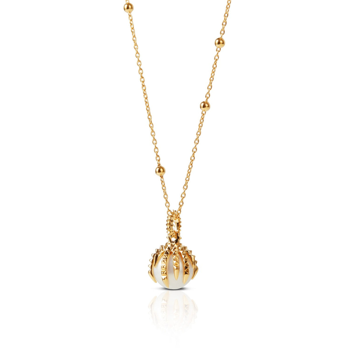 This necklace is crafted from 925 Sterling Silver with 18-karat Yellow Plating. It features a 10 mm pearl and an extension chain with a lobster clasp.