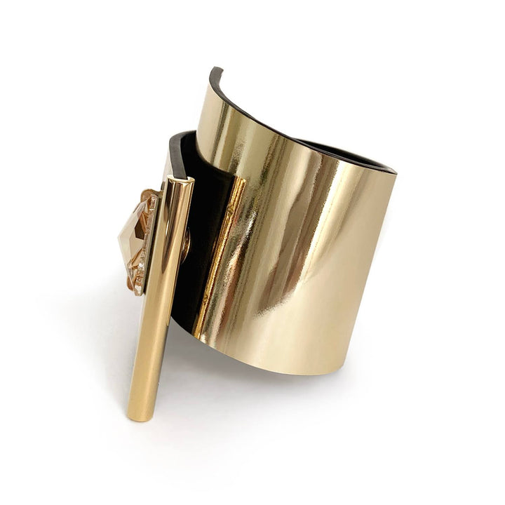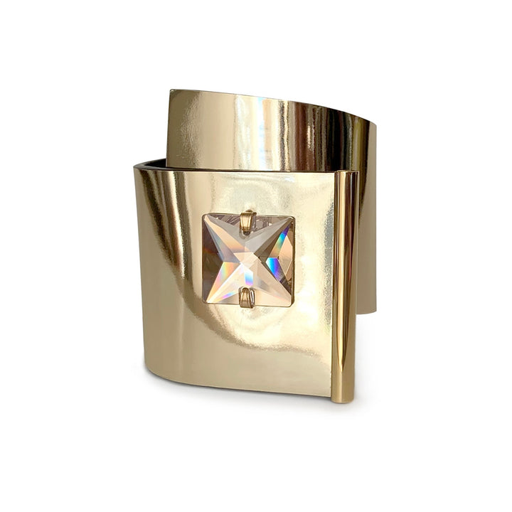 The Luxury Versa Cuff Bracelet by Katherine Riardant is a limited edition piece with a stylish and contemporary design. It's made from highly reflective mirror eco leather and is meticulously handcrafted in Italy. The cuff's focal point is a bold Swarovski crystal and a 24-karat gold-plated custom metal element, making it a luxurious and eye-catching accessory.