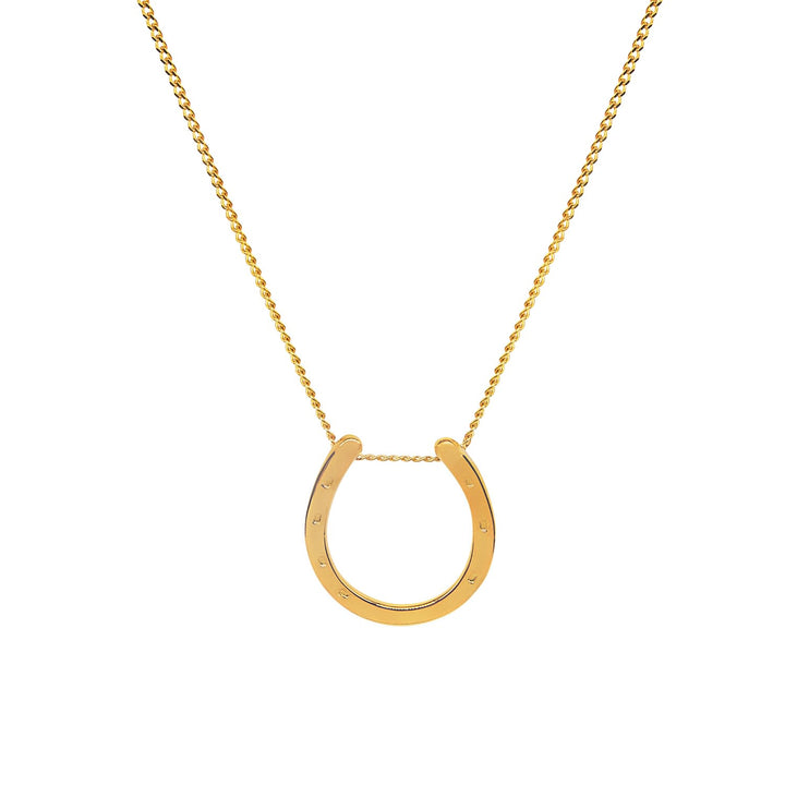 This pendant necklace features a horseshoe charm made from recycled silver. It comes with an adjustable 16-18 inch gold-plated curb chain. The charm has two bails on the reverse.