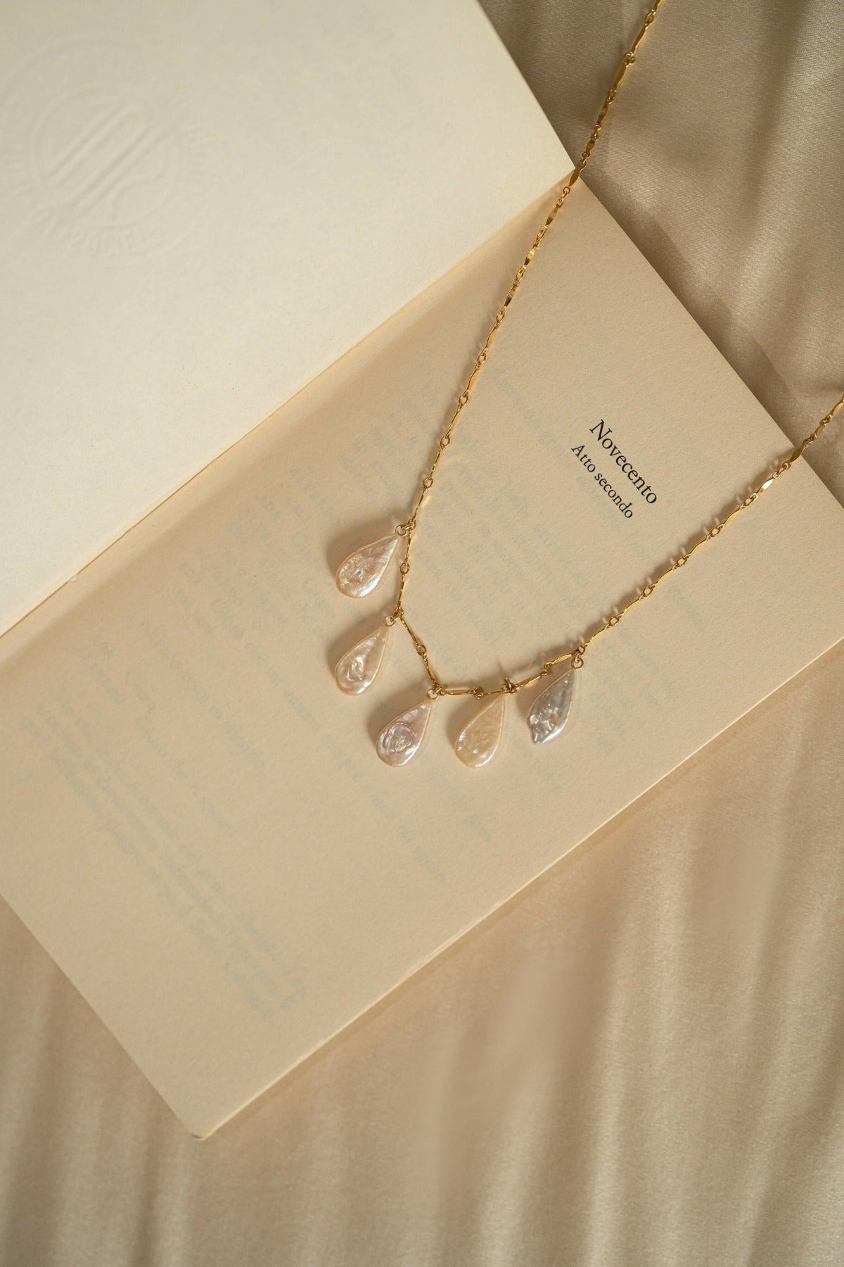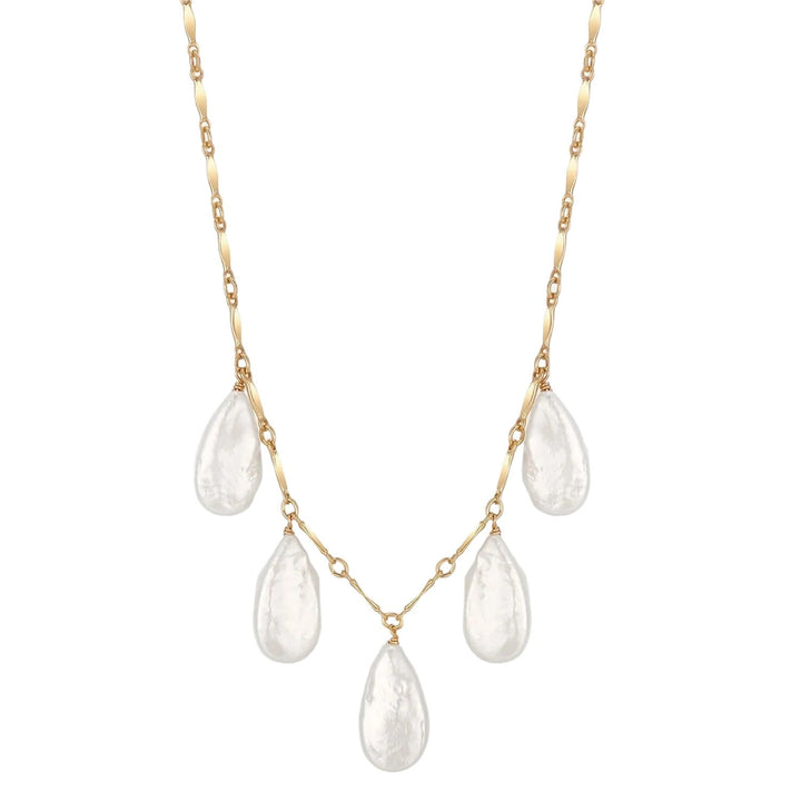 The Lina Pearl Necklace is a handcrafted, elegant accessory. It features unique drop-shaped natural pearls and a 14k gold-filled bar and hook chain. The necklace is hypoallergenic and suitable for sensitive skin, making it a perfect gift or a special treat for oneself.
