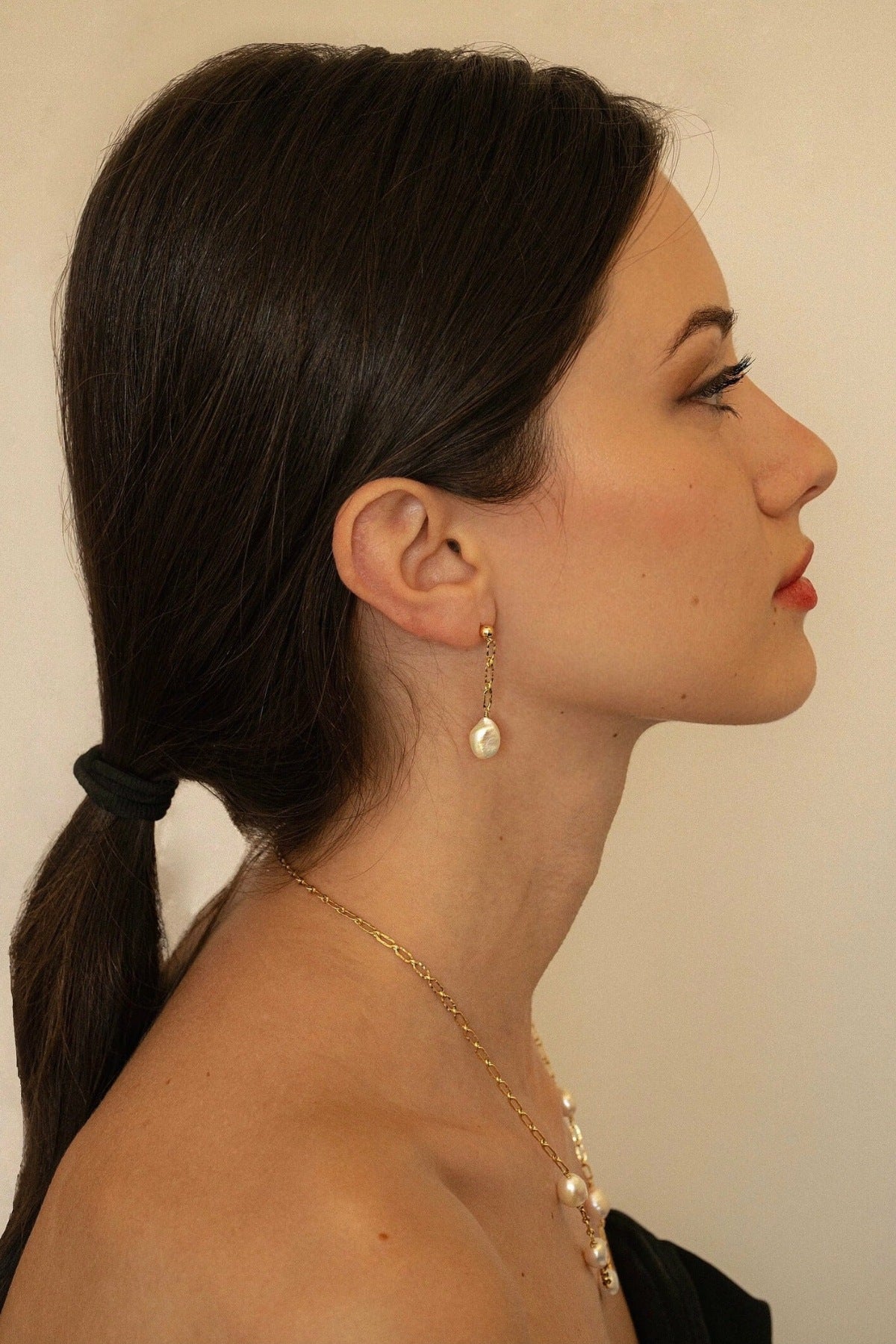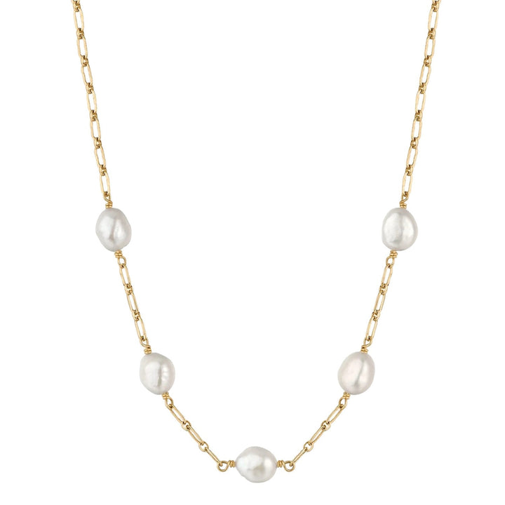 This necklace is handcrafted with baroque pearls and a 14k gold-filled patterned chain. It is hypoallergenic and safe for sensitive skin.