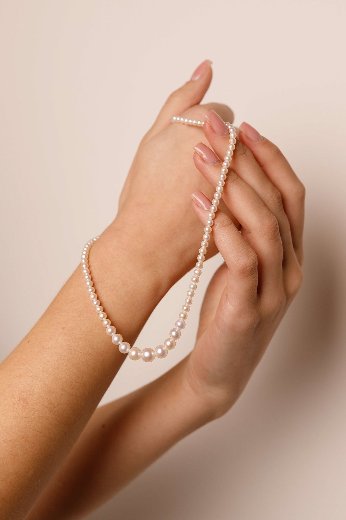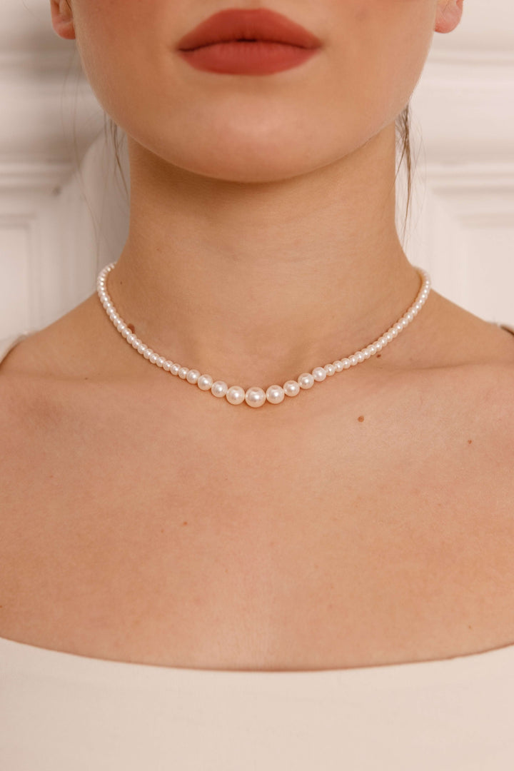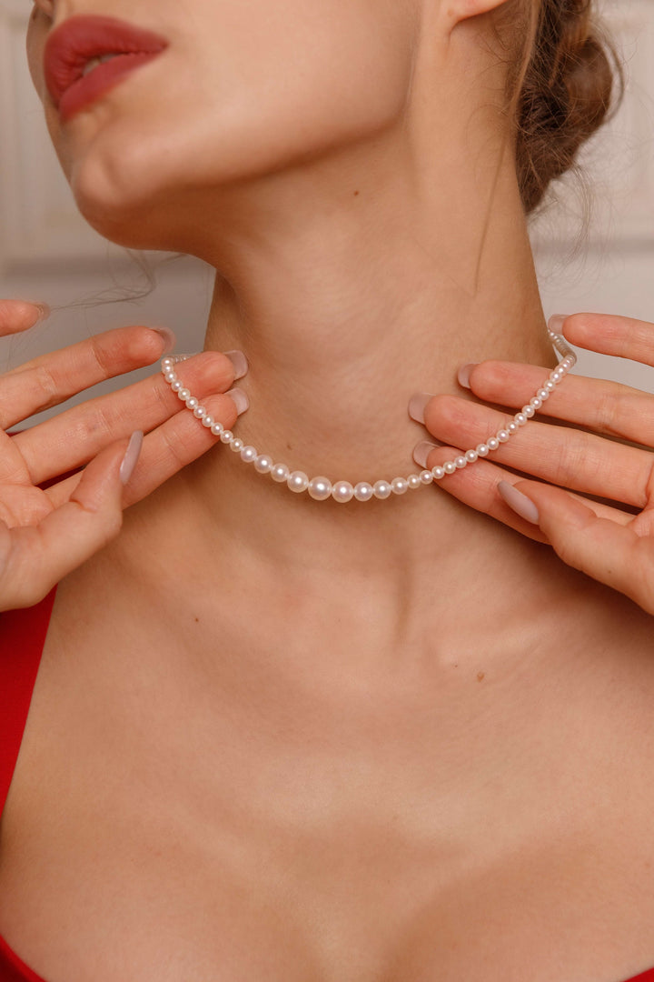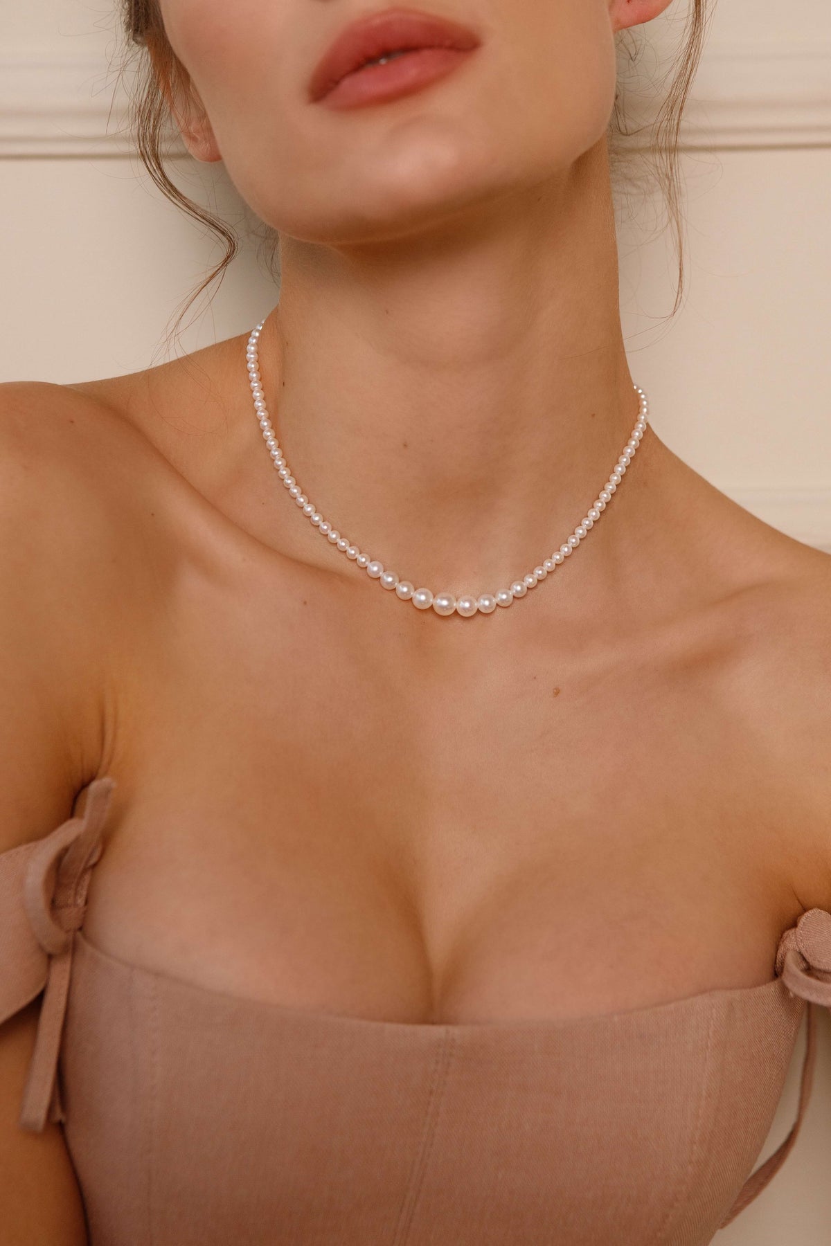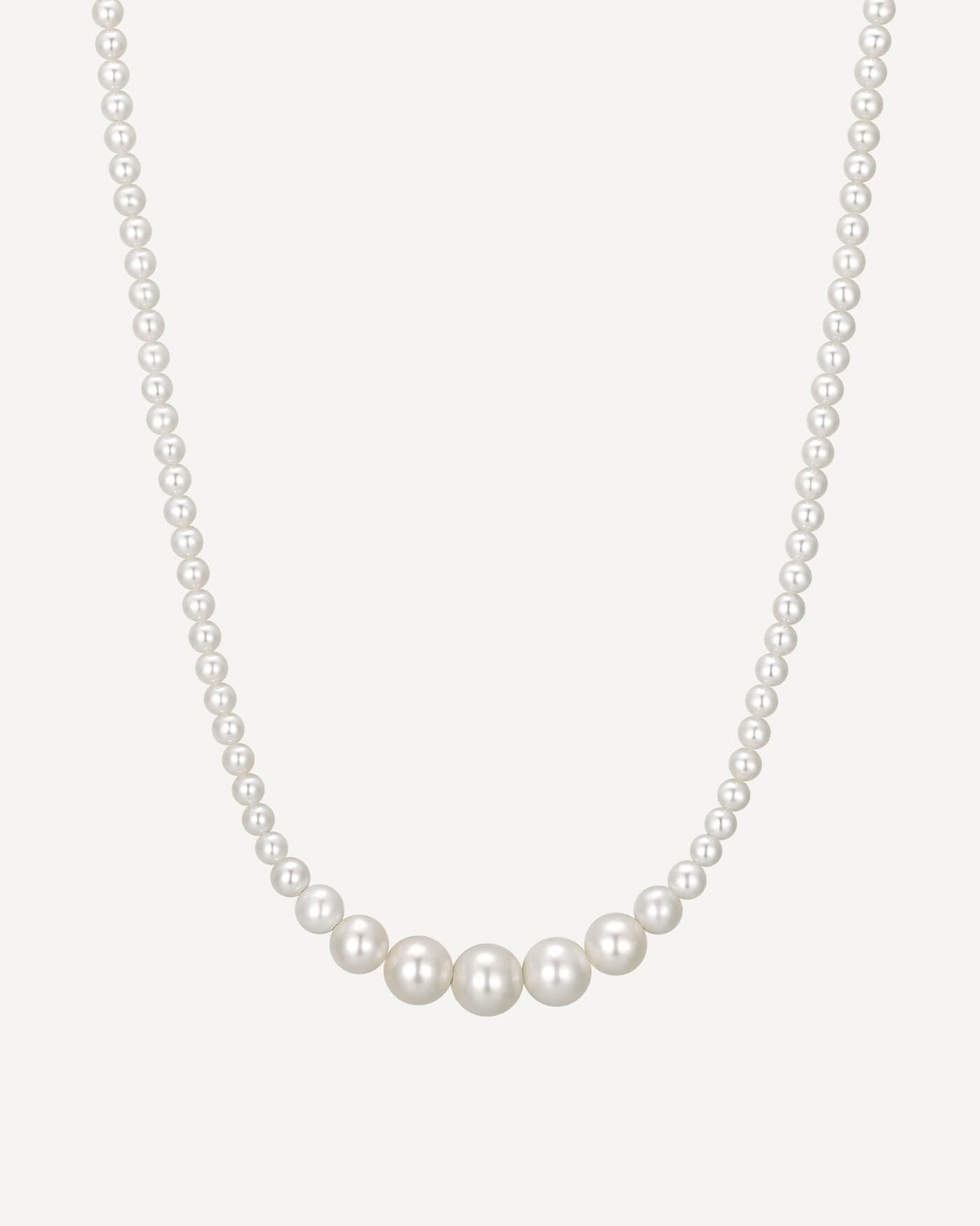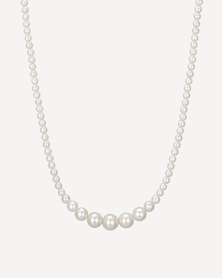 This necklace is crafted with freshwater pearls in a gradient design. It features a sustainable magnetic closure and is hypoallergenic. The pearls are natural, so their shape and size may vary slightly.