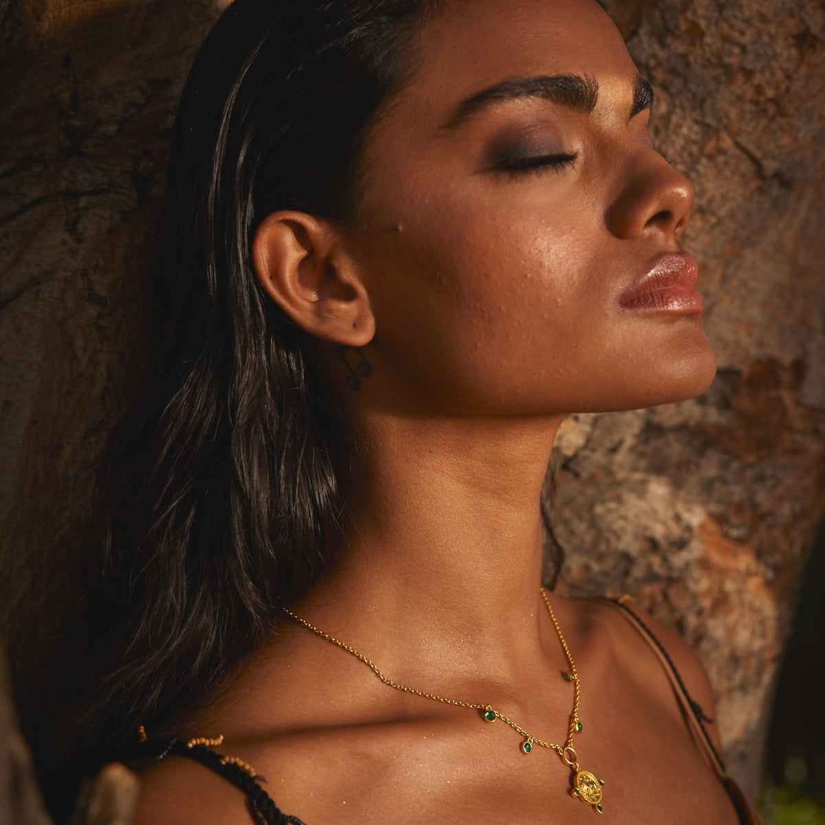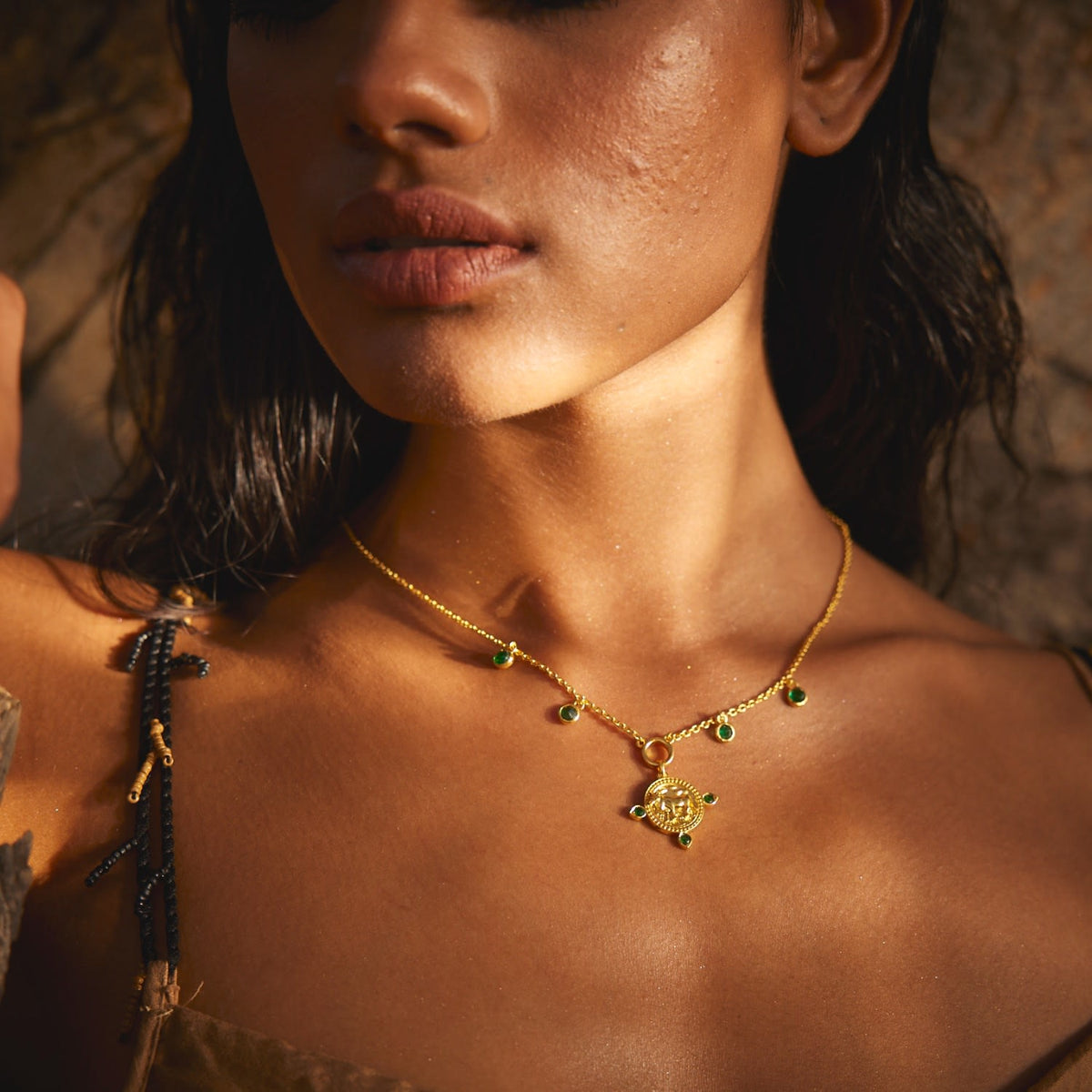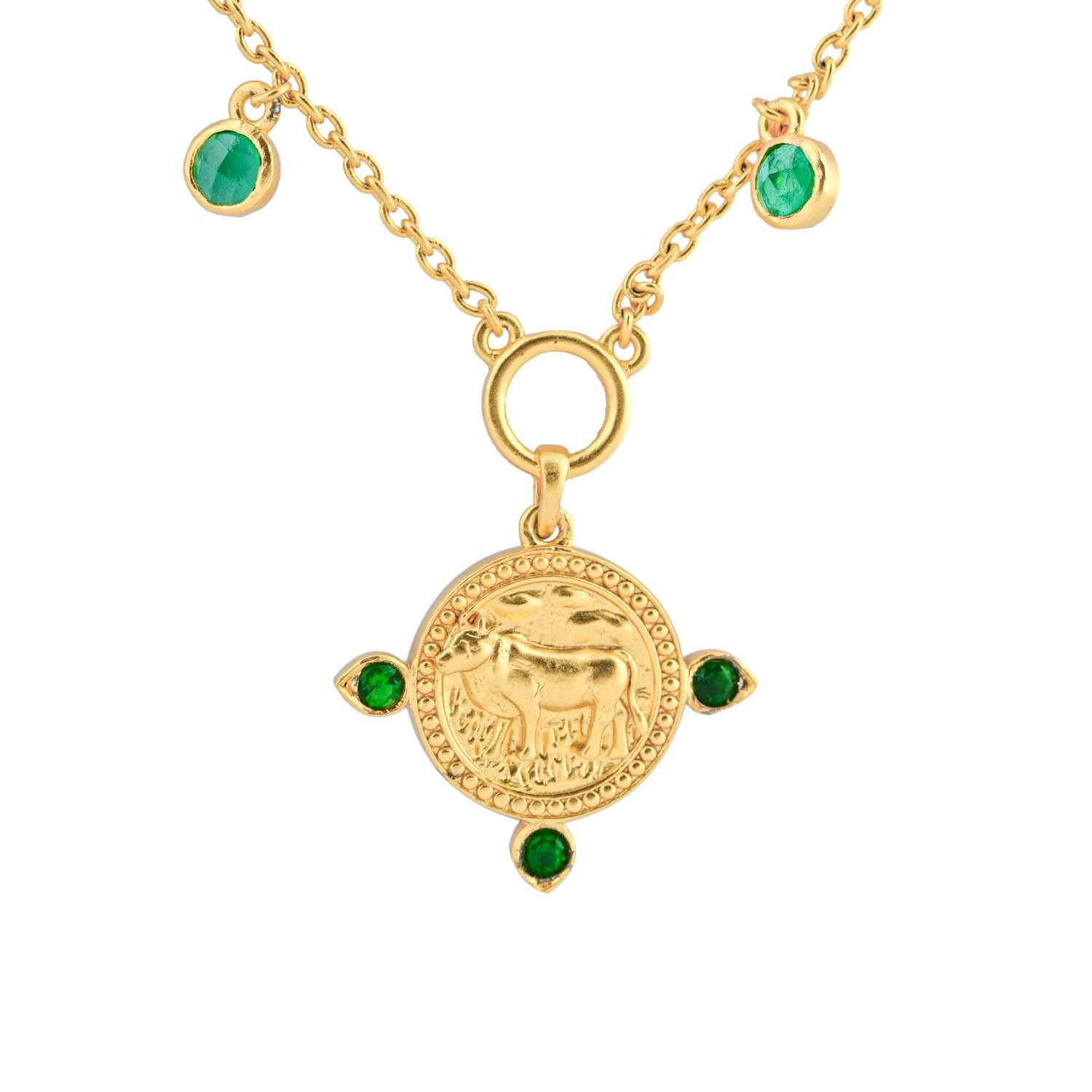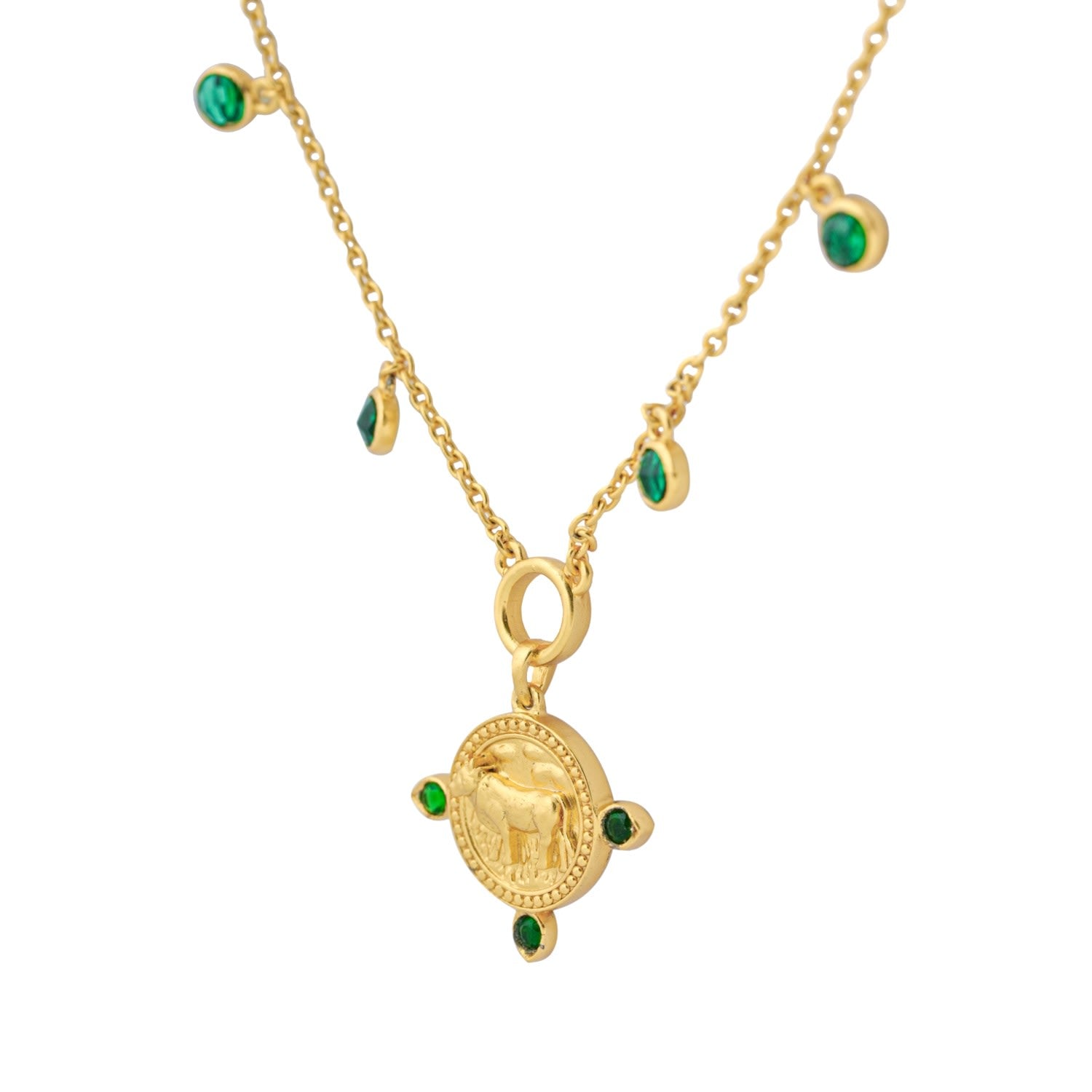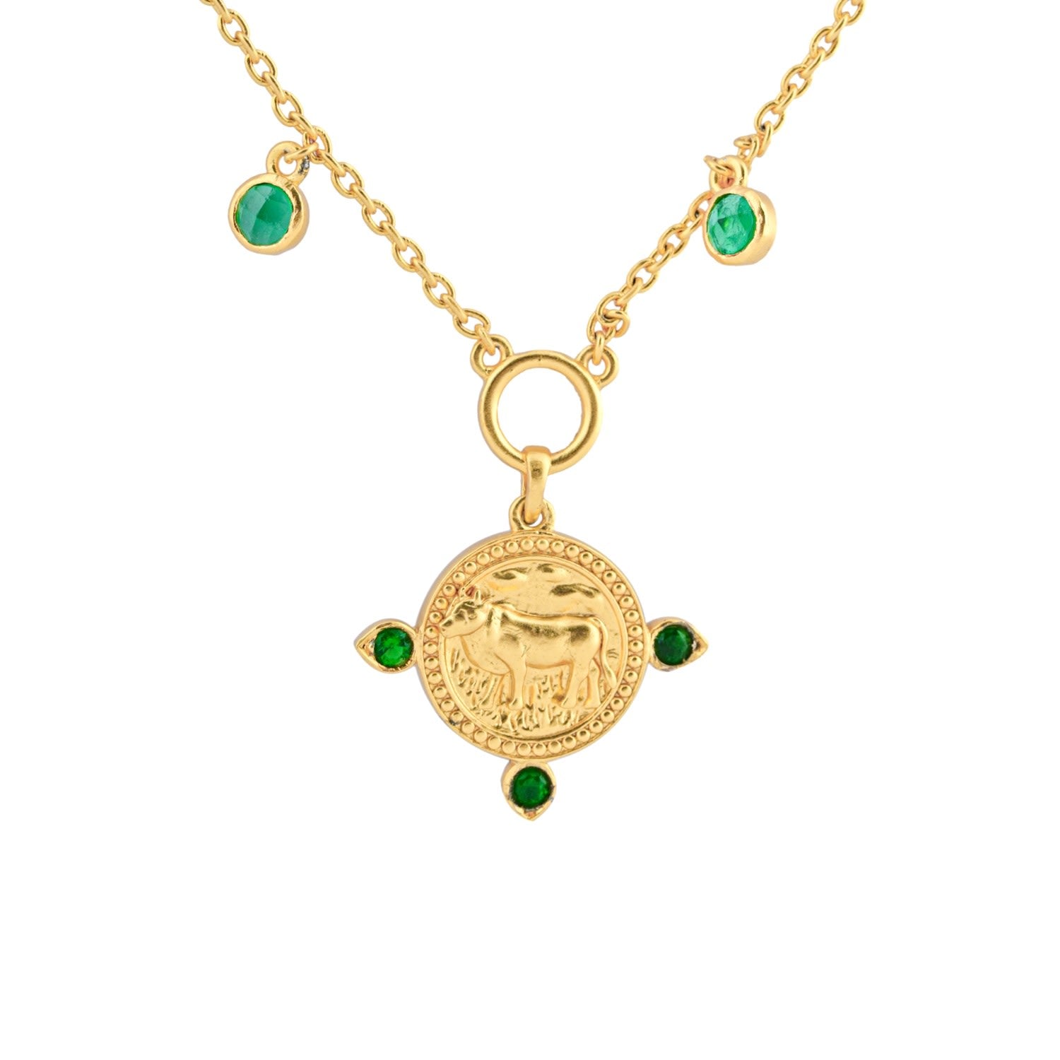 This necklace is made with 22K gold vermeil on sterling silver. The amulet is adorned with an emerald birthstone.