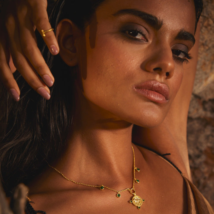 The Taurus Zodiac Amulet Necklace by Kensho Heirlooms is a meaningful and powerful piece. The tribal bull medallion embodies patience and inner strength, and is adorned with an emerald, the Taurus birthstone. The necklace is a reminder to embrace your unwavering determination.