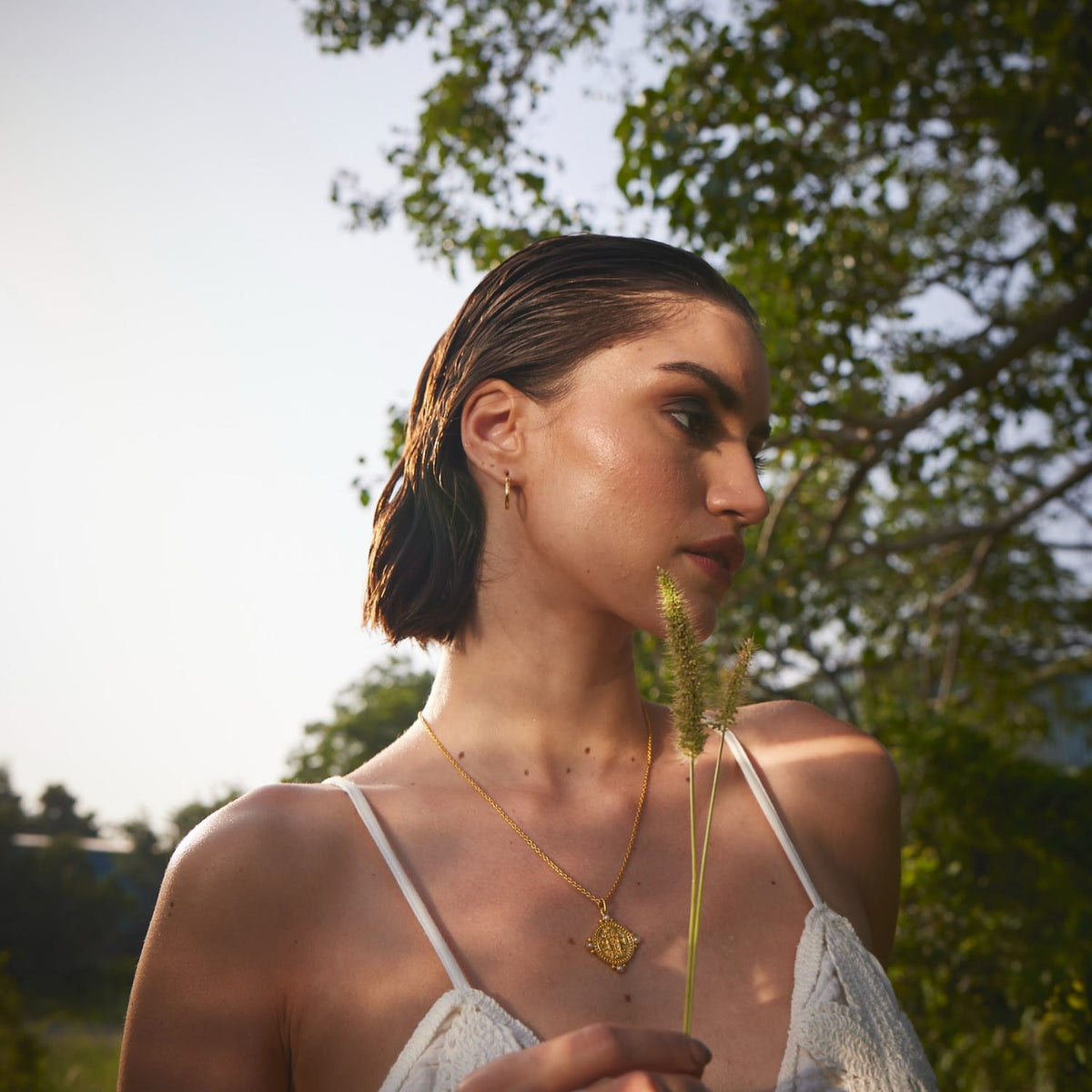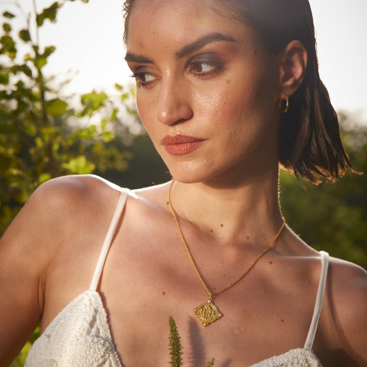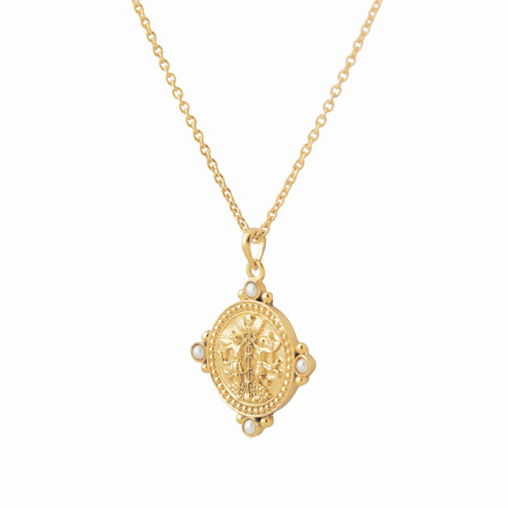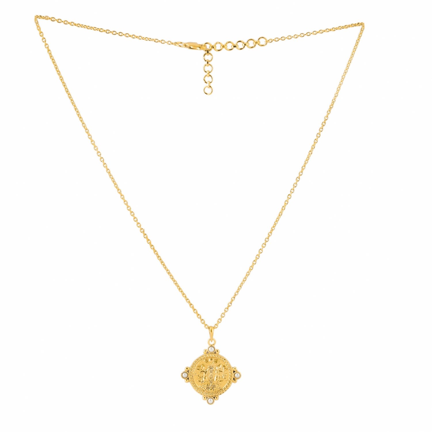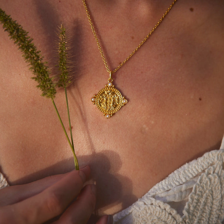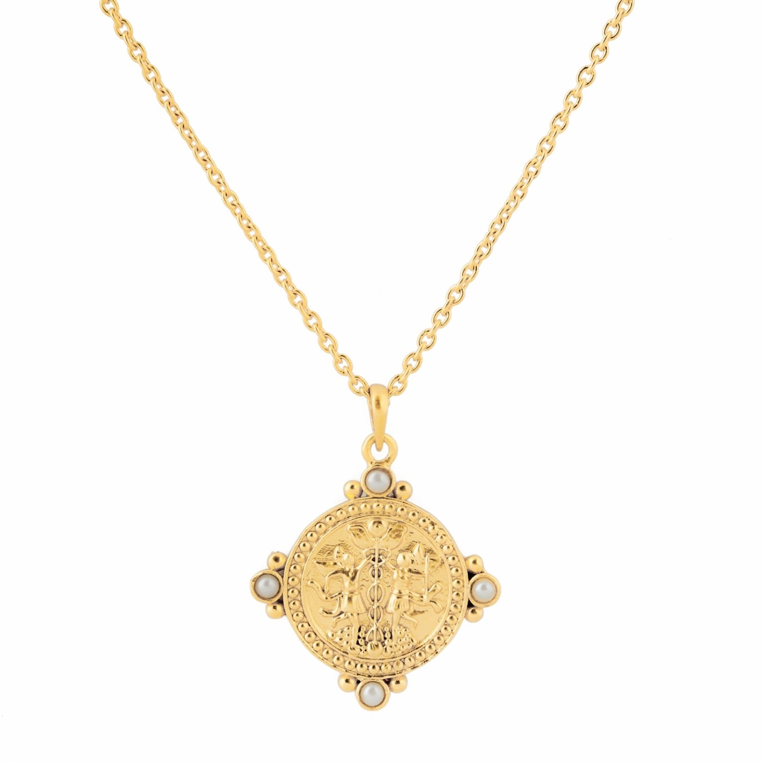 This The Gemini Zodiac Amulet Necklace In Gold by Kensho Heirlooms is a celebration of the unique duality and adaptable spirit of the Gemini sign. Adorned with a medallion featuring the Mutable Twins and accented with pure pearls, this necklace beautifully merges the past and the present. It serves as a powerful amulet for those who embody a blend of swift intelligence and innate serenity, making it a meaningful piece that connects you to your astrological identity.