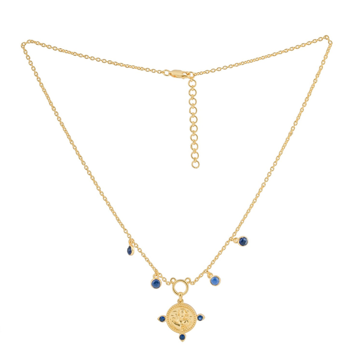 This necklace is crafted from 22k gold vermeil on sterling silver and features a formidable blue sapphire. It is designed in London.