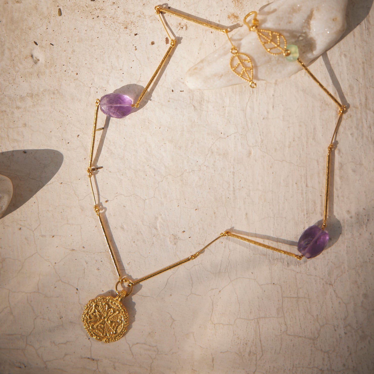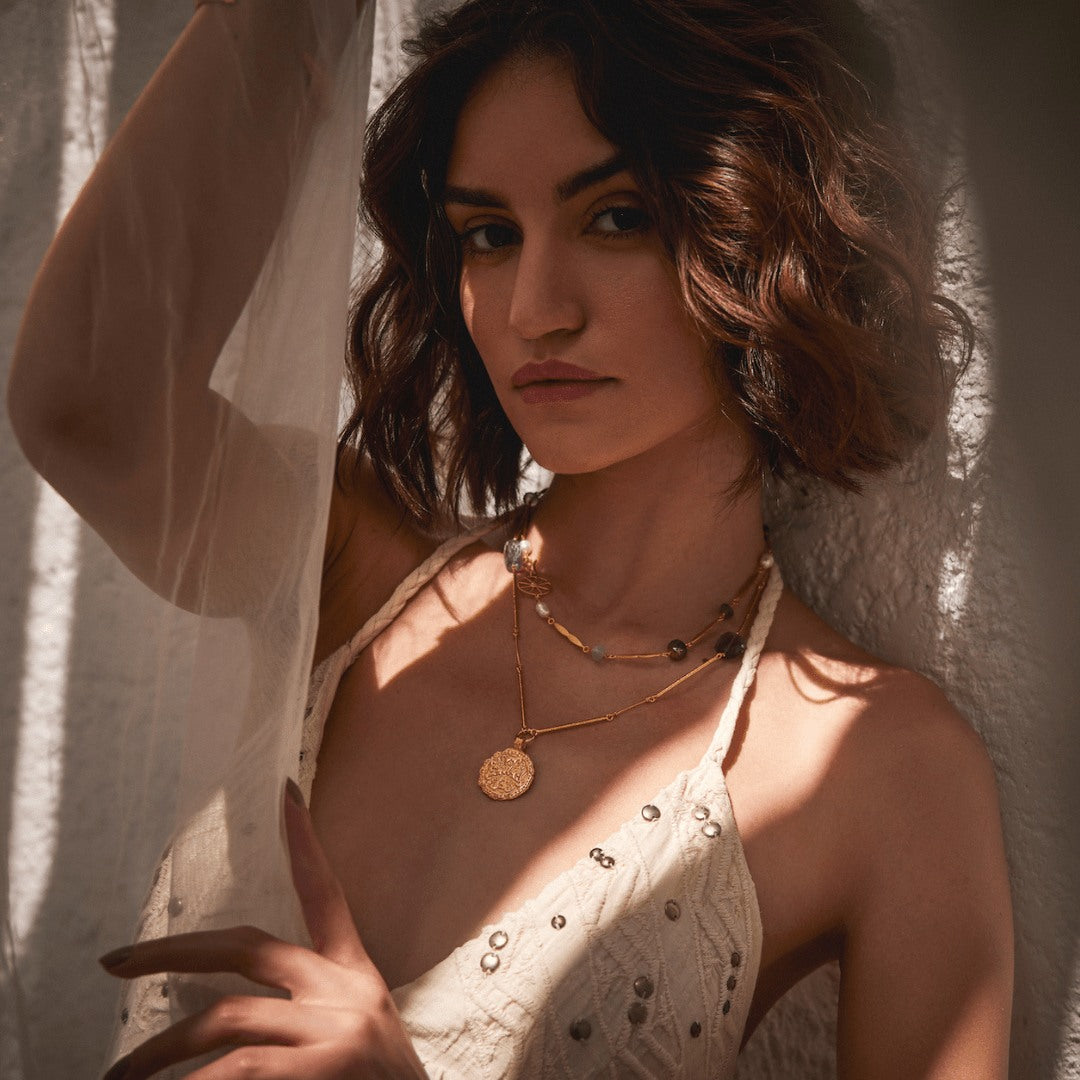 This Circle Of Shalom Gold Gemstone Necklace by Kensho Heirlooms is a museum-inspired masterpiece that captures the opulence of Byzantine metalwork from the 6th–7th century. It features a Gold Cross, Amethysts, and a Jade, creating a true fusion of history and modern elegance. The cross symbolizes protection and prayer, while intricately detailed leaves on the back represent a journey of perpetual growth. This piece is a tangible connection to the past, designed for the modern individual.