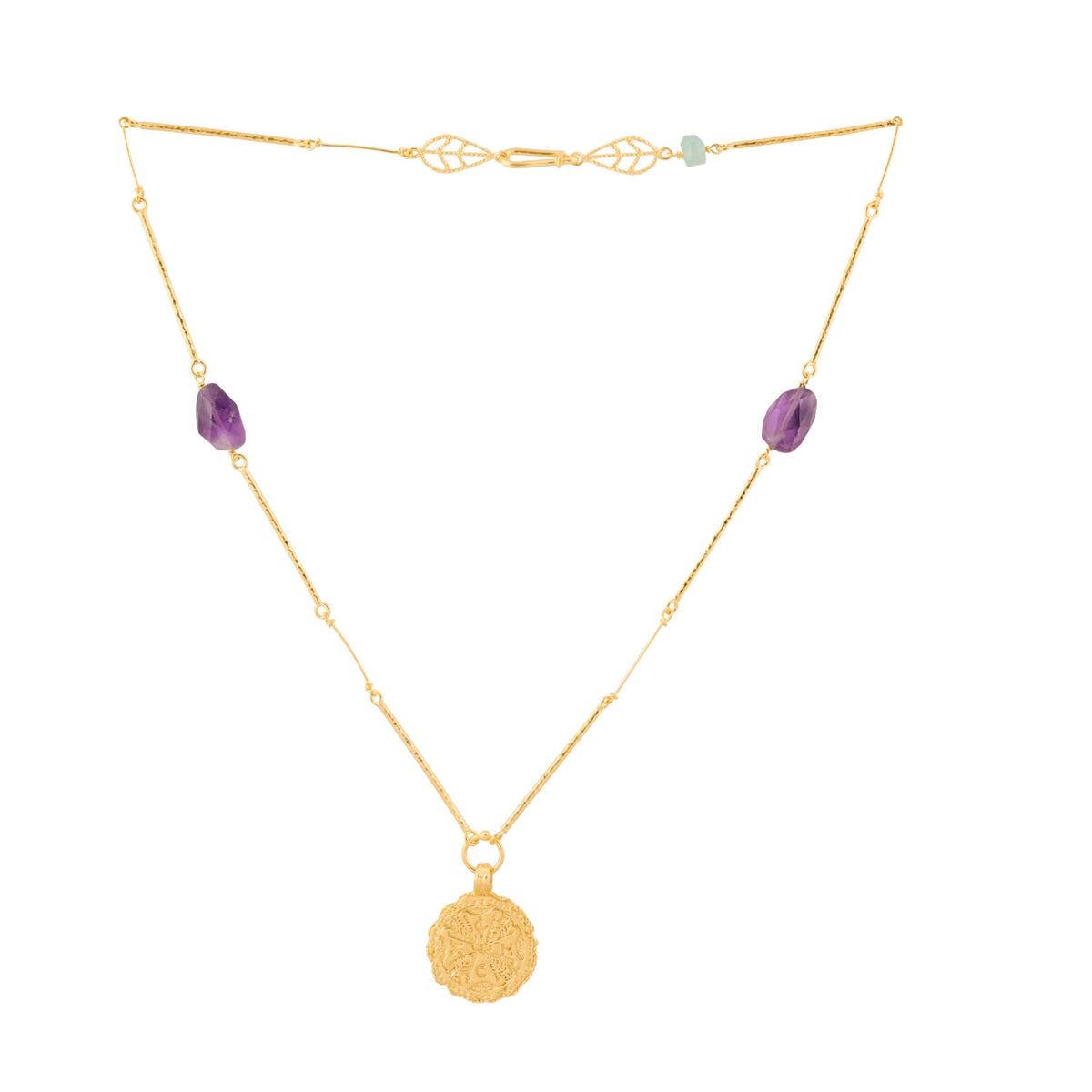 Crafted from 22-karat gold vermeil on solid sterling silver, this necklace features a gold cross, two amethysts, and one jade. This handcrafted piece took 12 days to create.