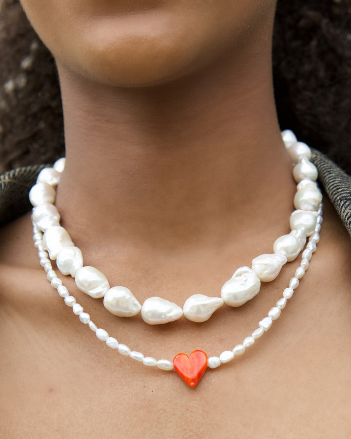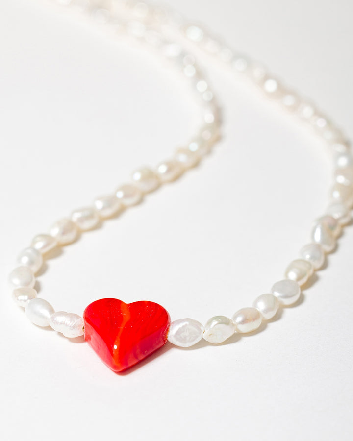 This Riviera Crush Necklace With Glass Heart & Genuine Pearls by Kybele Studio is a playful yet elegant accessory. It combines the classic beauty of genuine freshwater pearls with a bold red glass heart, creating a charming and joyful piece. This handmade necklace is a perfect "love letter to summer" and adds a vibrant pop of color to your neckline.