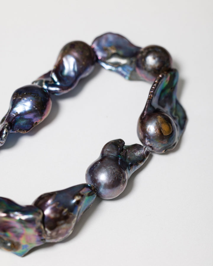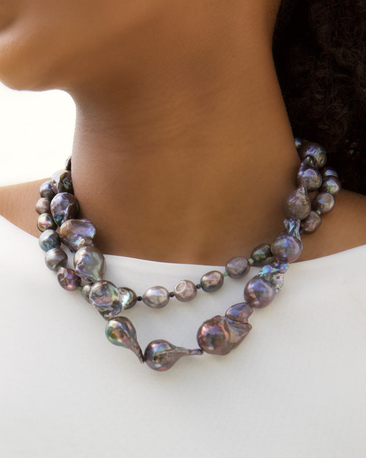 This Capri Necklace by Kybele Studio celebrates bold individuality with its dark baroque pearls. These pearls shift between inky violet and soft bronze hues, capturing the effortless elegance of the Italian coast. This necklace is a sun-drenched statement that symbolizes unique charm and inner wisdom.