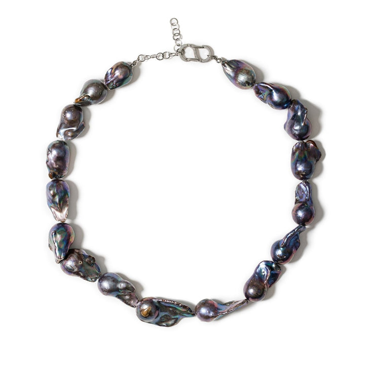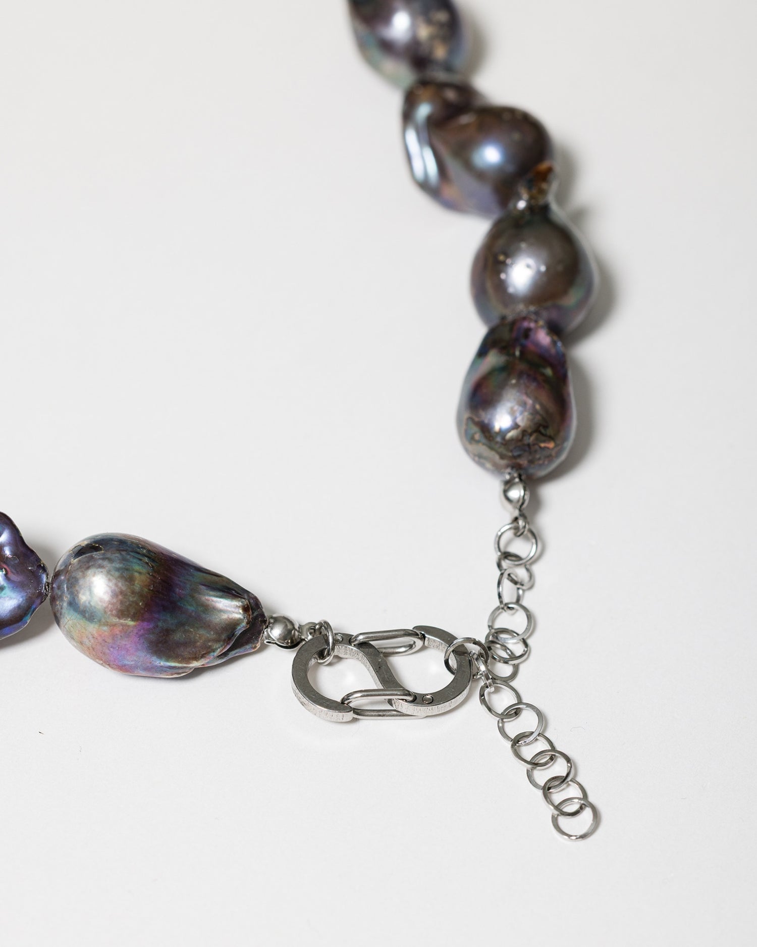 This necklace is lovingly handcrafted from dark baroque freshwater pearls and features a stainless steel clasp and extender.