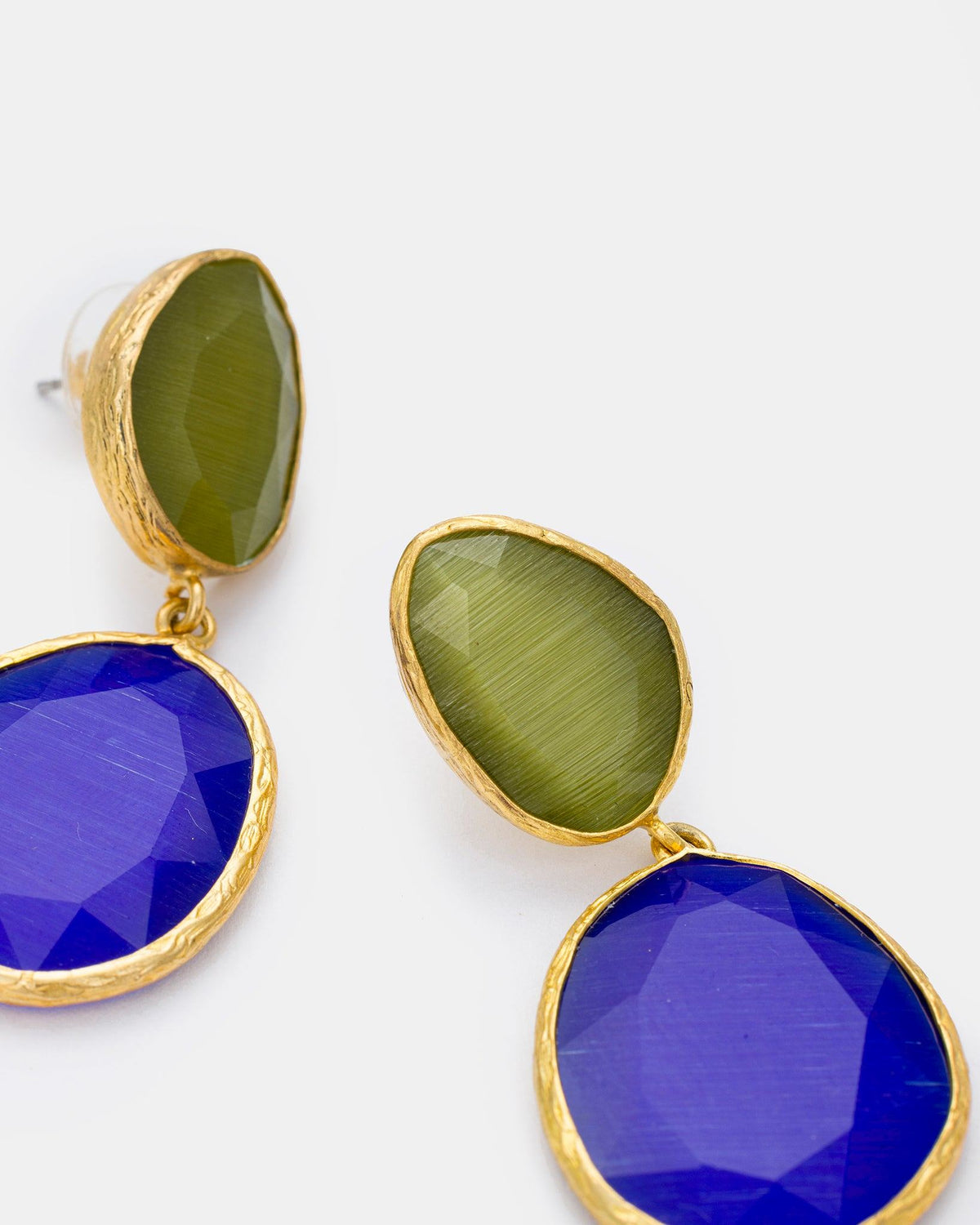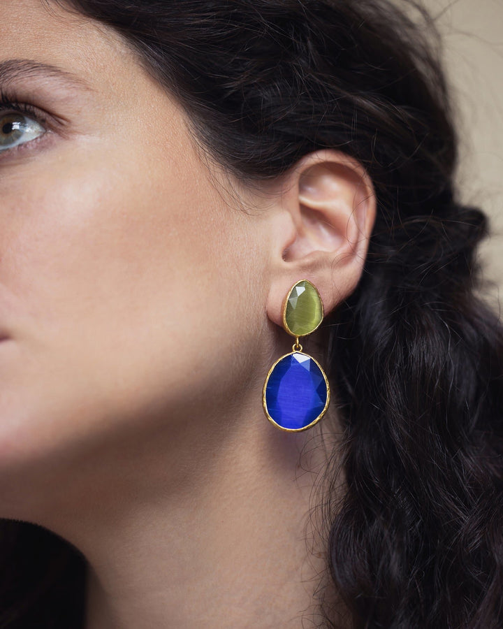 These Ocean Depths Cat Eye Earrings by Kybele Studio remind you of serene ocean waves and endless skies. The deep blue cat eye stones, known for their protective energy and ability to promote clarity, create a beautiful and calming accessory. Each pair is unique due to natural variations in the stones.
