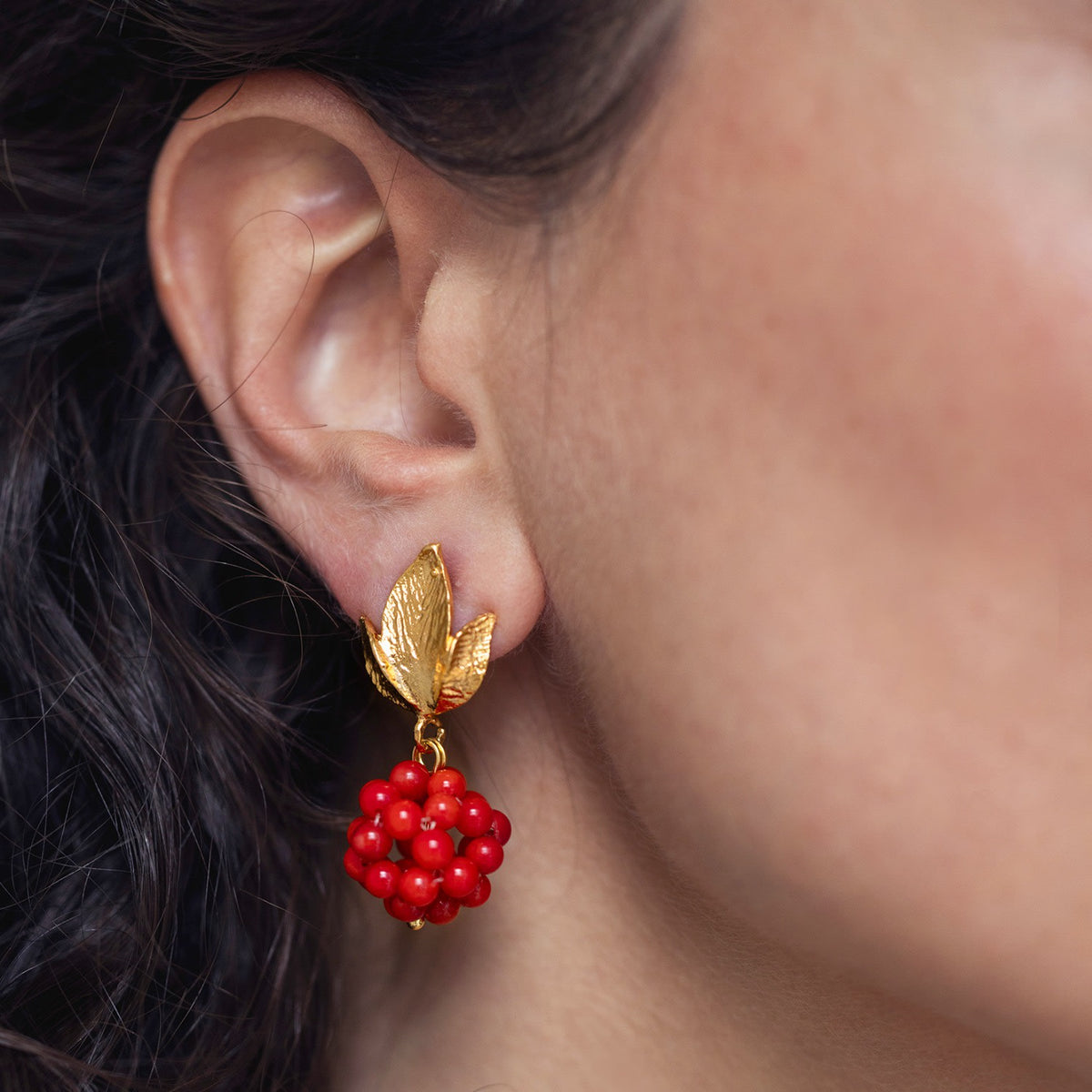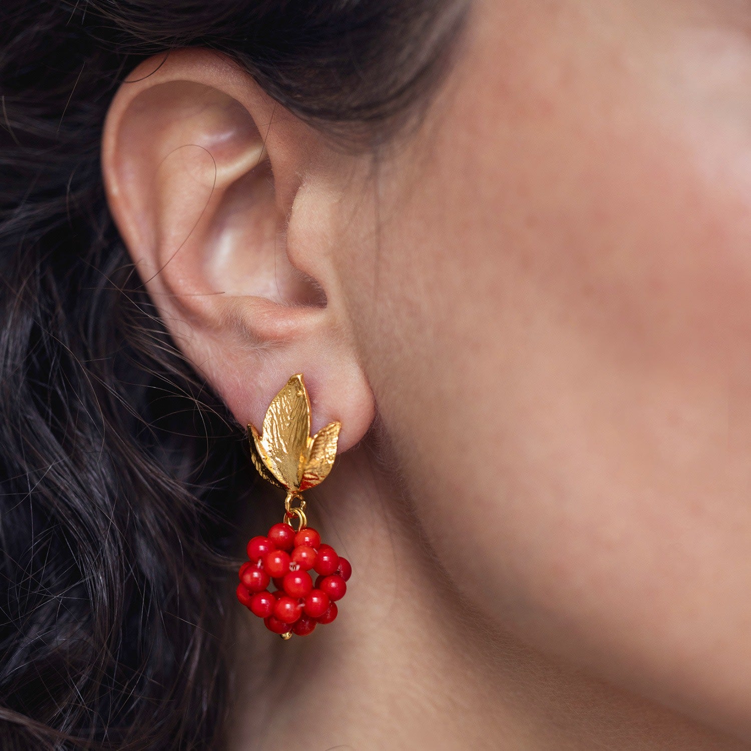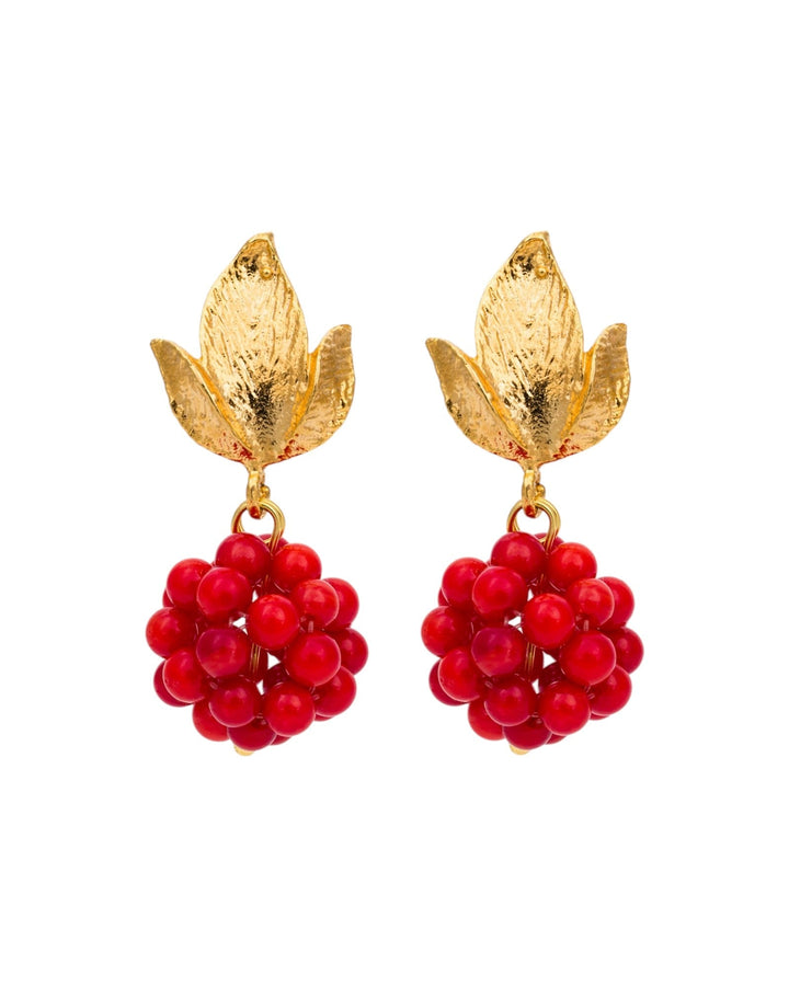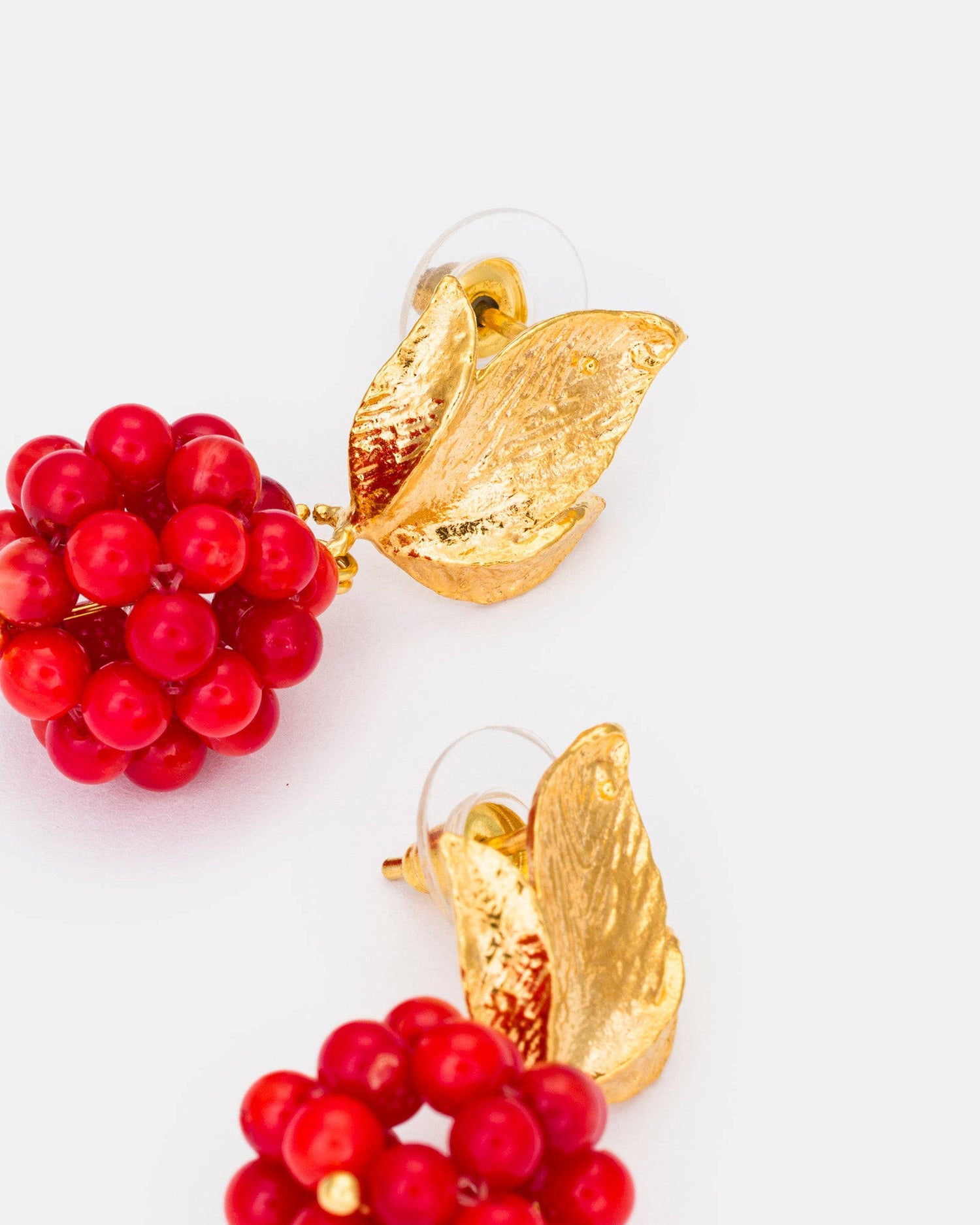 These Berry Cluster Earrings With Gold Leaf Design by Kybele Studio are a beautiful touch of nature-inspired elegance. The vibrant red beads, delicately formed into a lush cluster, are crowned with an intricately detailed gold-tone leaf. These earrings radiate sophistication and playful energy, making a bold accent to your look.