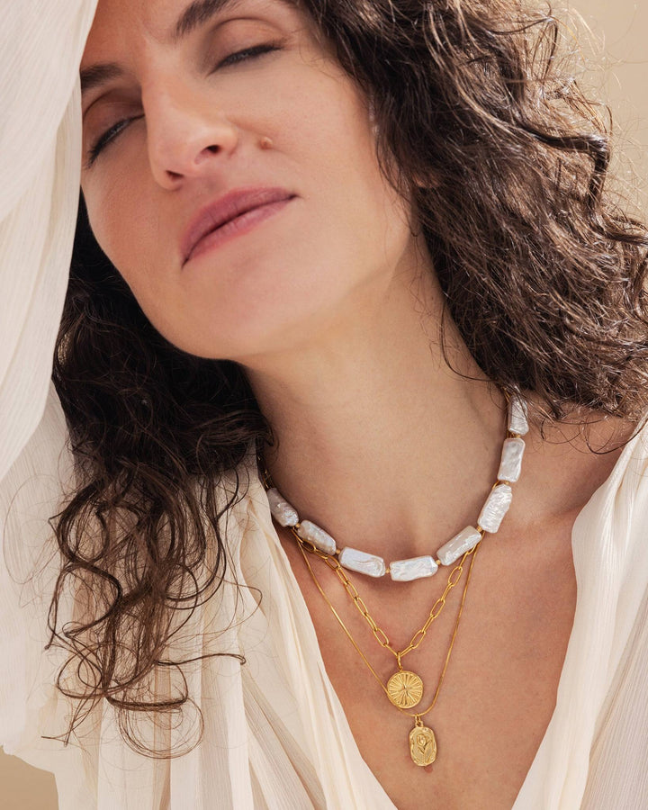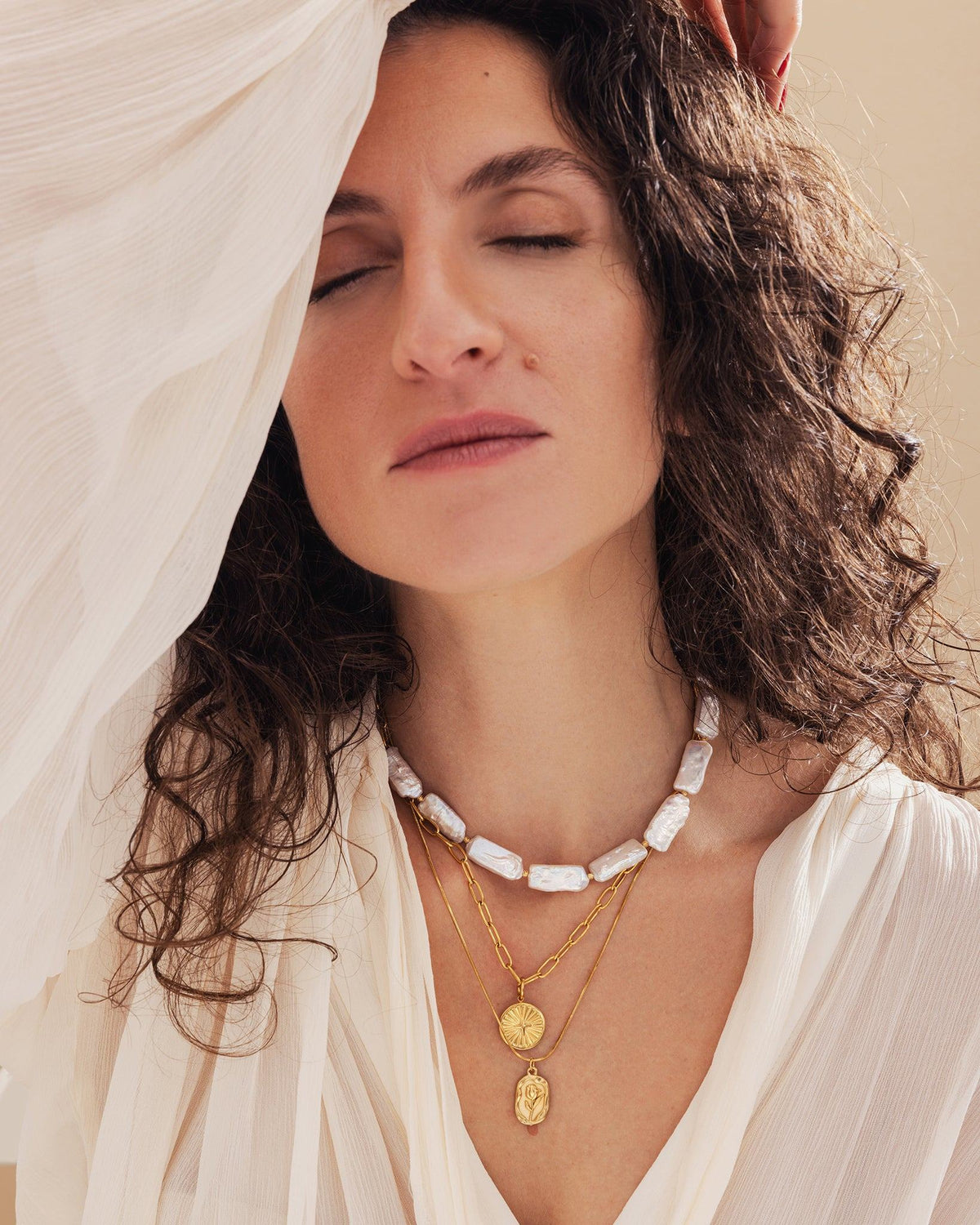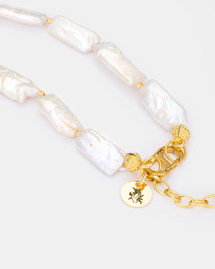 This Baroque Pearl Necklace by Kybele Studio is a stunning piece that celebrates the organic beauty of nature. The irregular, unique shapes of the baroque freshwater pearls symbolize purity, wisdom, and transformation. Handcrafted with care, this necklace radiates an understated elegance and individuality, making it a timeless addition to any jewelry collection.