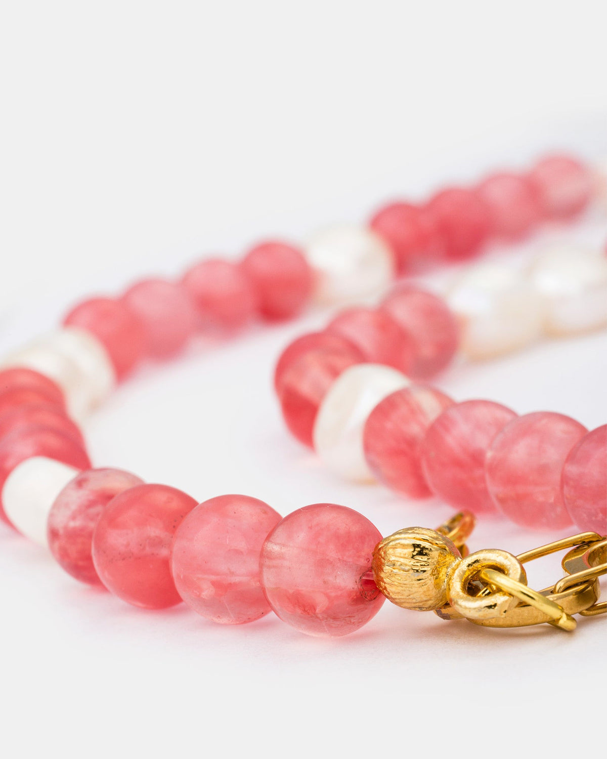 This necklace is carefully handmade with natural strawberry quartz and freshwater pearls.