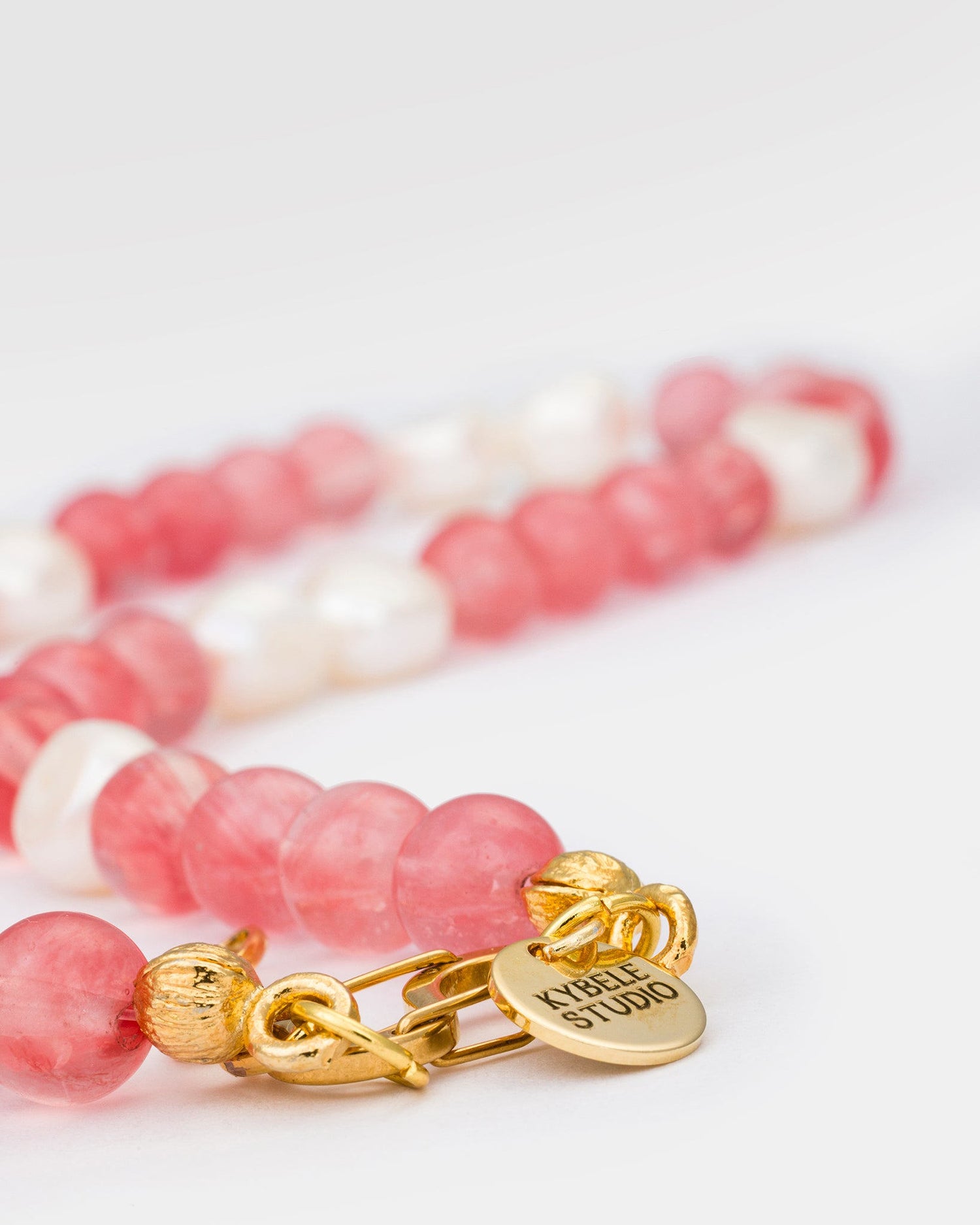 This Blush Radiance Necklace With Strawberry Quartz & Pearls by Kybele Studio celebrates gentle elegance with its blush tones and luminous textures. The necklace features radiant strawberry quartz, cherished for its loving energy, and luminous freshwater pearls, which symbolize purity and wisdom. Handcrafted in Luxembourg, each piece has a unique charm, bringing a touch of warmth and harmony to any ensemble. It is an ideal piece for adding a soft, refined, and meaningful touch to your look.