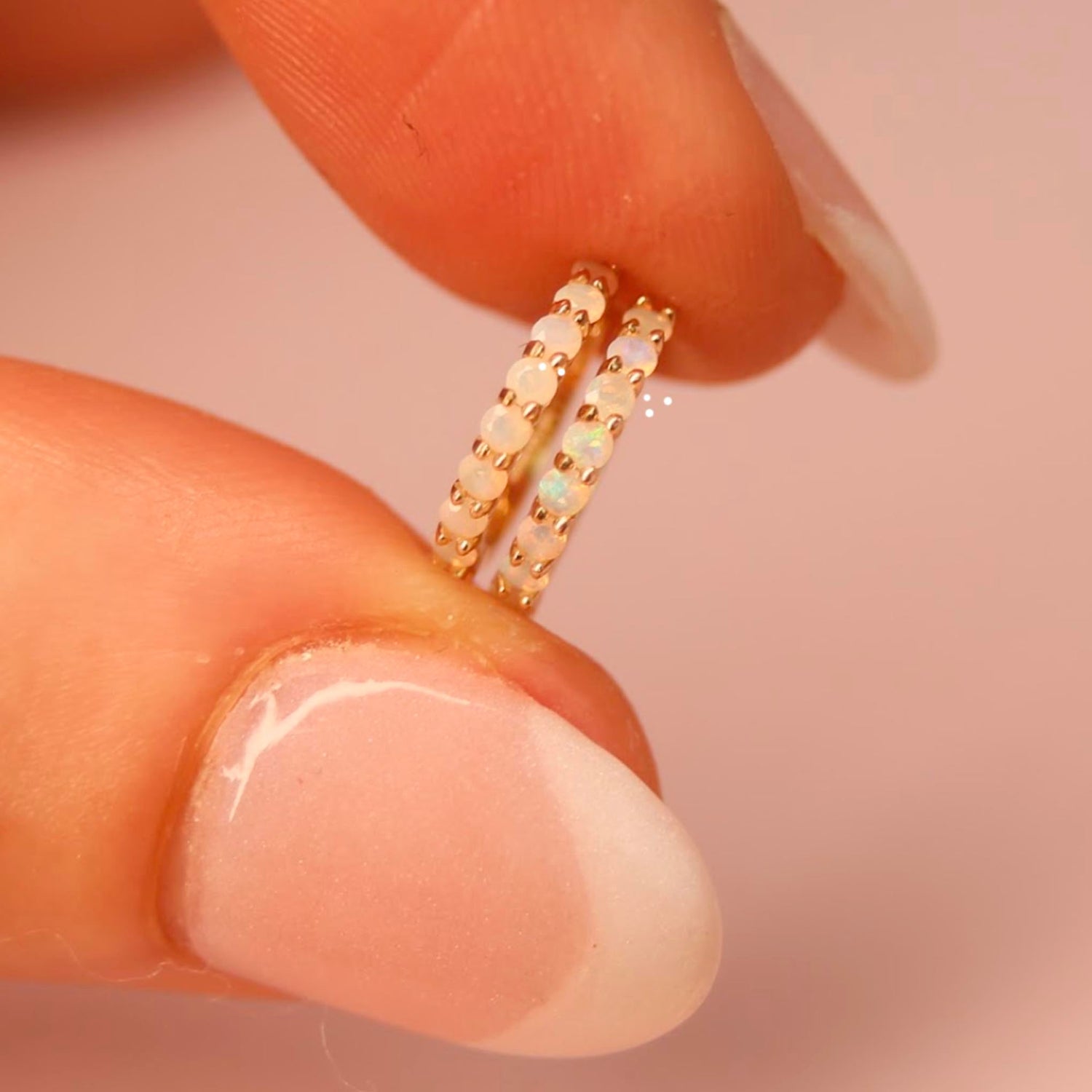 These huggie earrings are crafted from solid 14kt gold with natural Ethiopian opals. To clean, use a jewelry cleaner or a mild dish-washing liquid with a soft toothbrush. Rinse well and lay on a towel to dry.