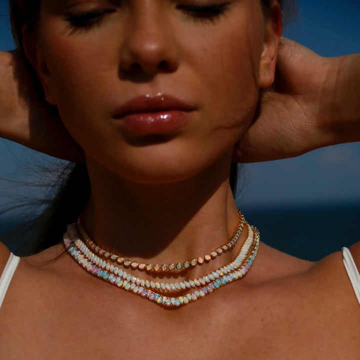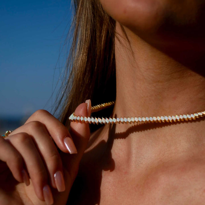 The Opal Fiare Tennis Necklace by La Kaiser is a gorgeous choker-length statement necklace. Made up of marquise-cut, lab-created opals, this necklace is both stylish and versatile. The 18-karat gold plating over brass makes this an elegant and beautiful accessory for any occasion.