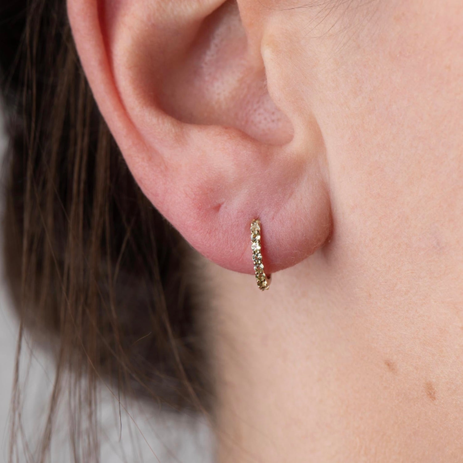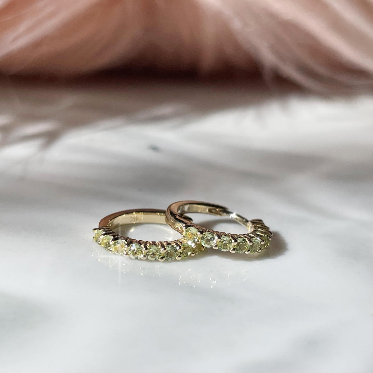 These hoops are made from Solid 14-karat gold and feature a total of 18 natural 1.5mm peridot stones.