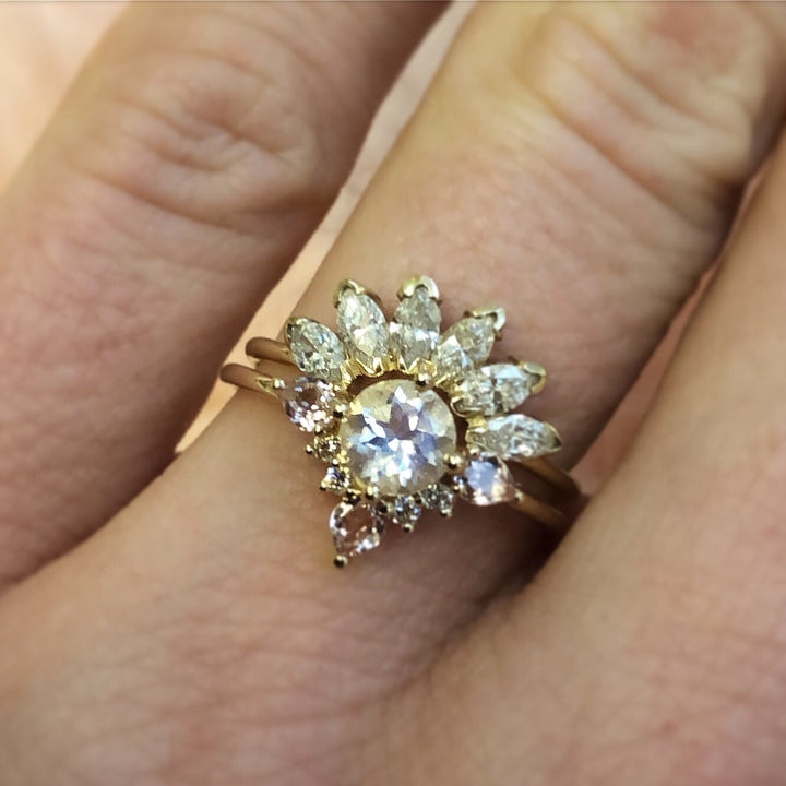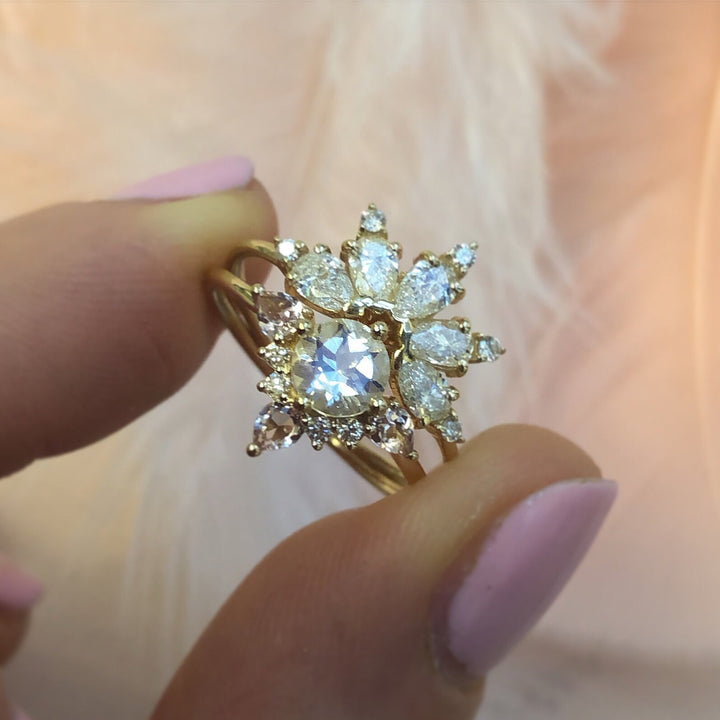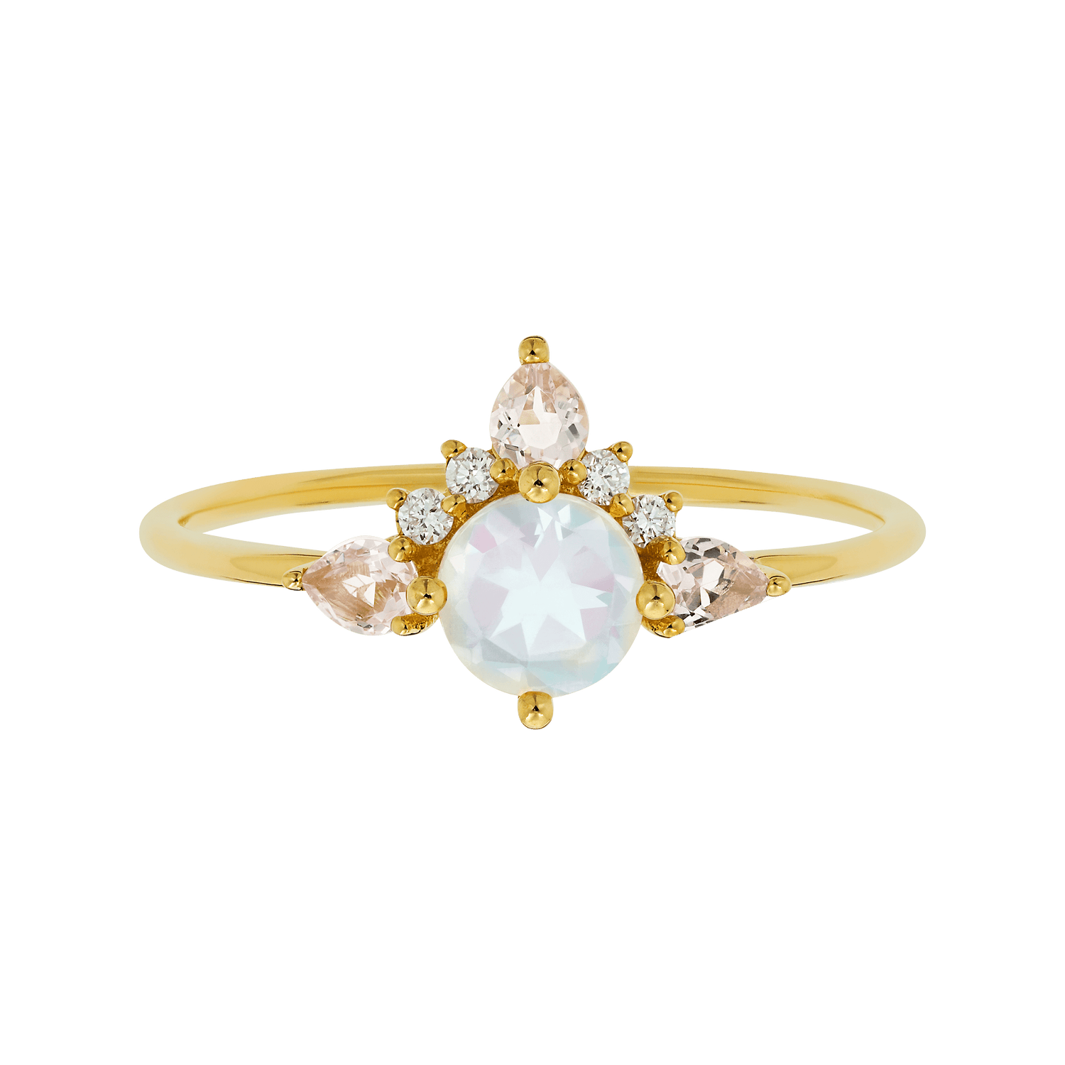Solid Gold Rainbow Moonstone, Morganite & Diamond Unicorn Ring