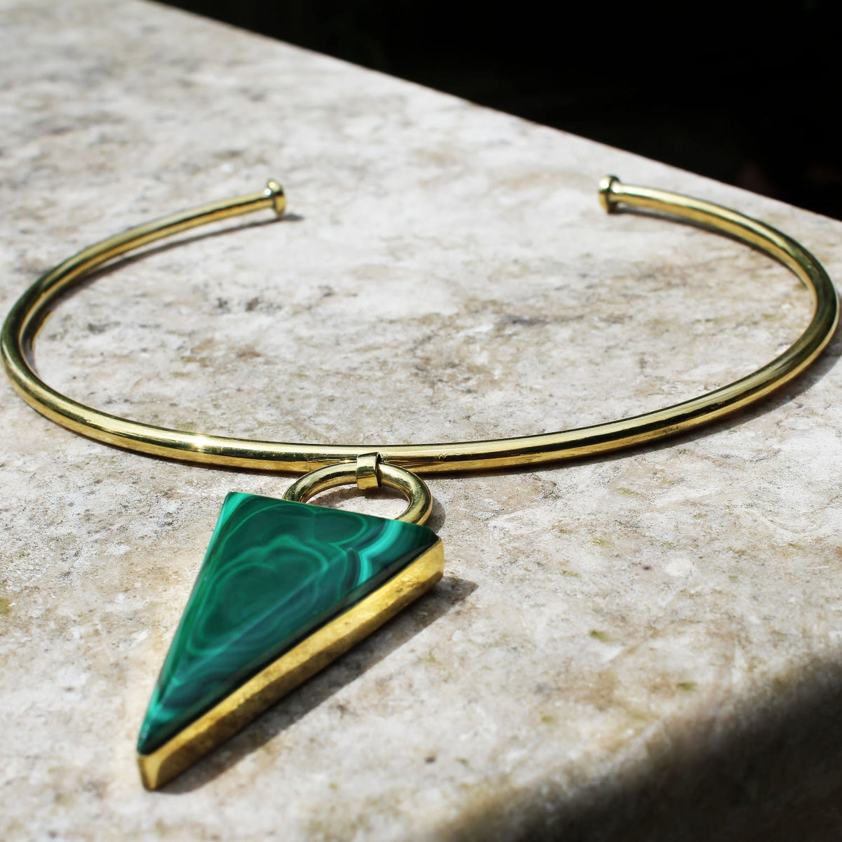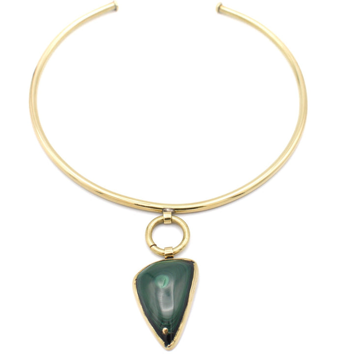 This limited edition choker is hand-crafted from brass and features an emerald green malachite stone pendant. It is made in Kenya.