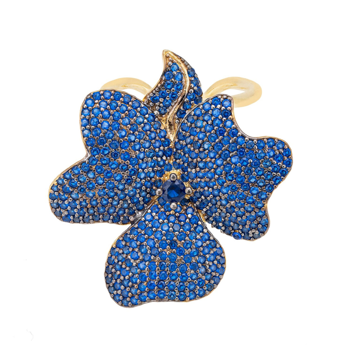 The Flower Cocktail Ring Gold Sapphire Blue by Latelita is a statement accessory with added sparkle. This cocktail ring features a large flower adorned with sparkling sapphire blue cubic zirconia. It sits atop double metallic adjustable bands and is made from 925 sterling silver dipped in 18ct gold.