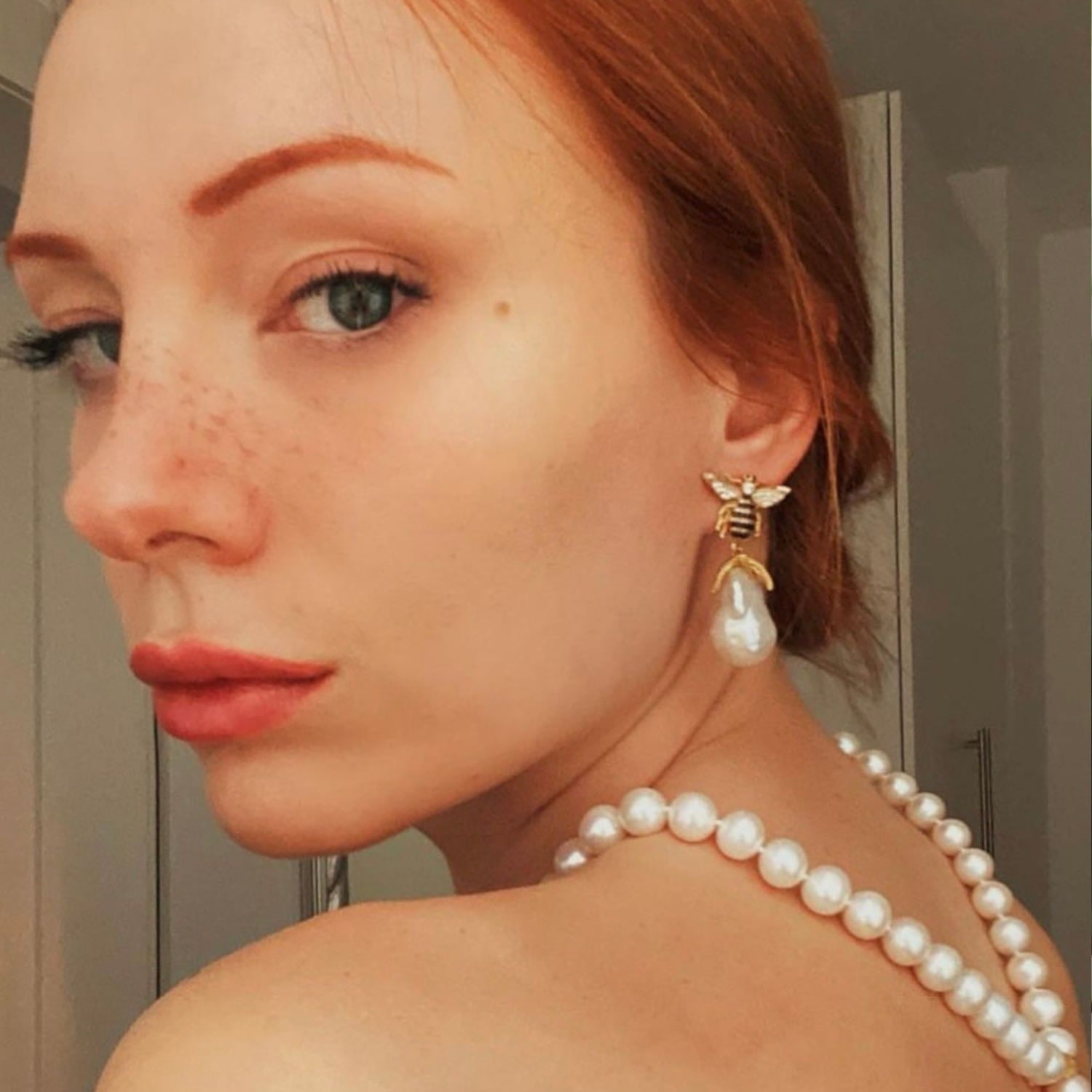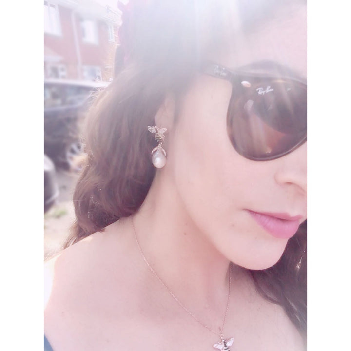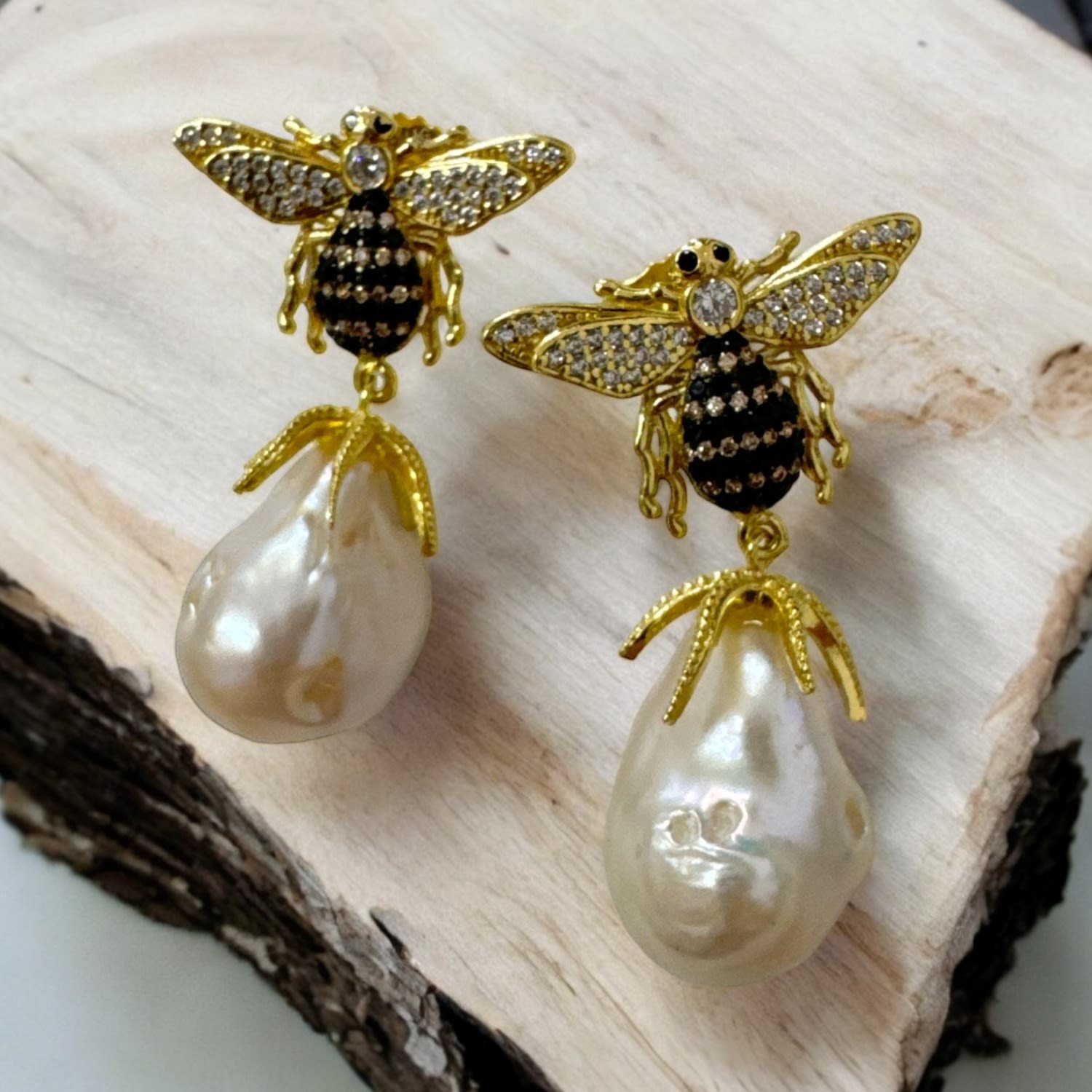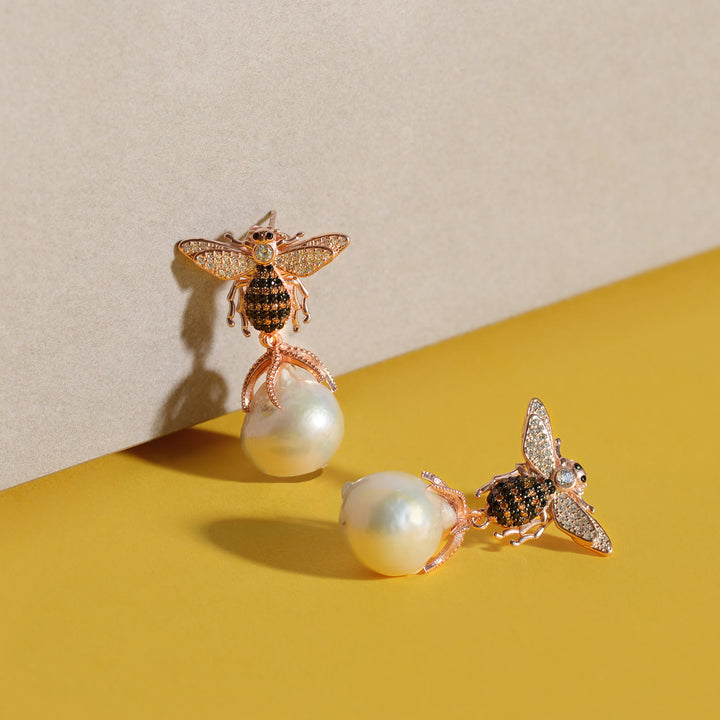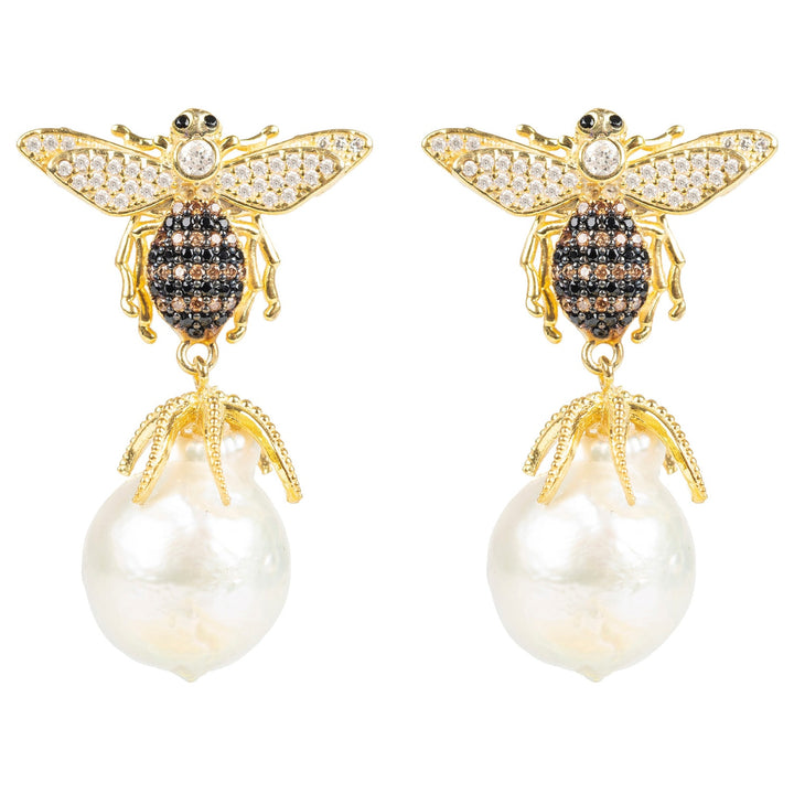Baroque Pearl Honey Bee Drop Earrings Gold