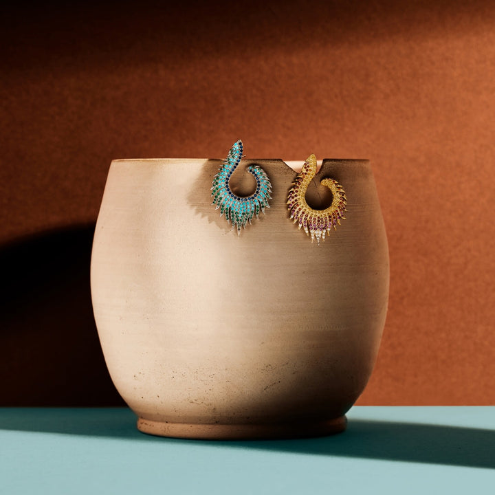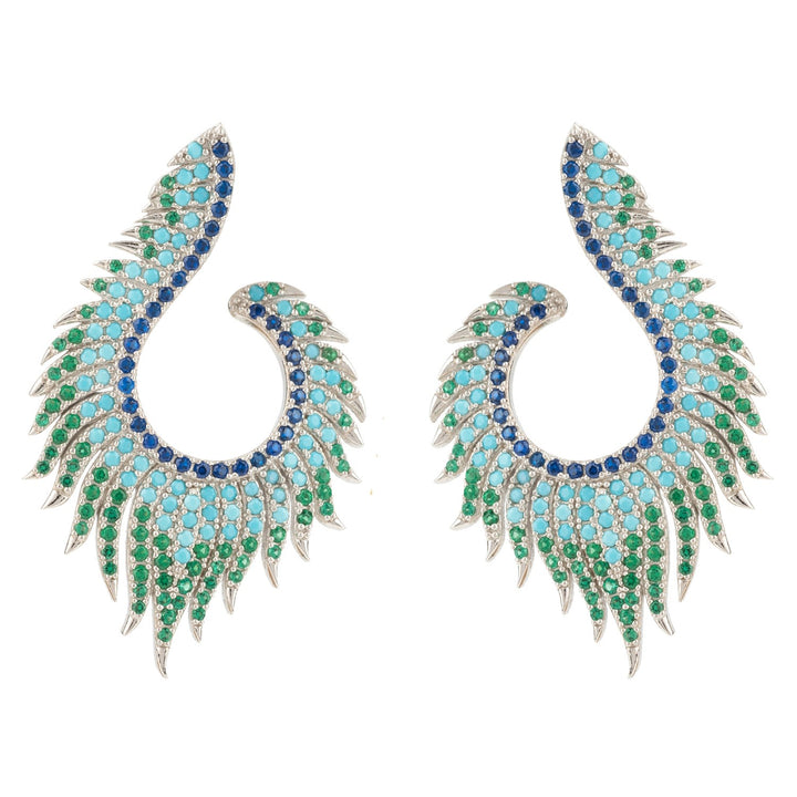 The Flame Earrings Cold Ice Silver by Latelita are a bold and hypnotic accessory. These flame-inspired stud earrings are handcrafted in sterling silver and adorned with AAA grade cubic zirconia in cool shades of blue and green. They make a perfect finishing touch to any evening, bridal, or wedding outfit, offering a statement piece with both color and sparkle.