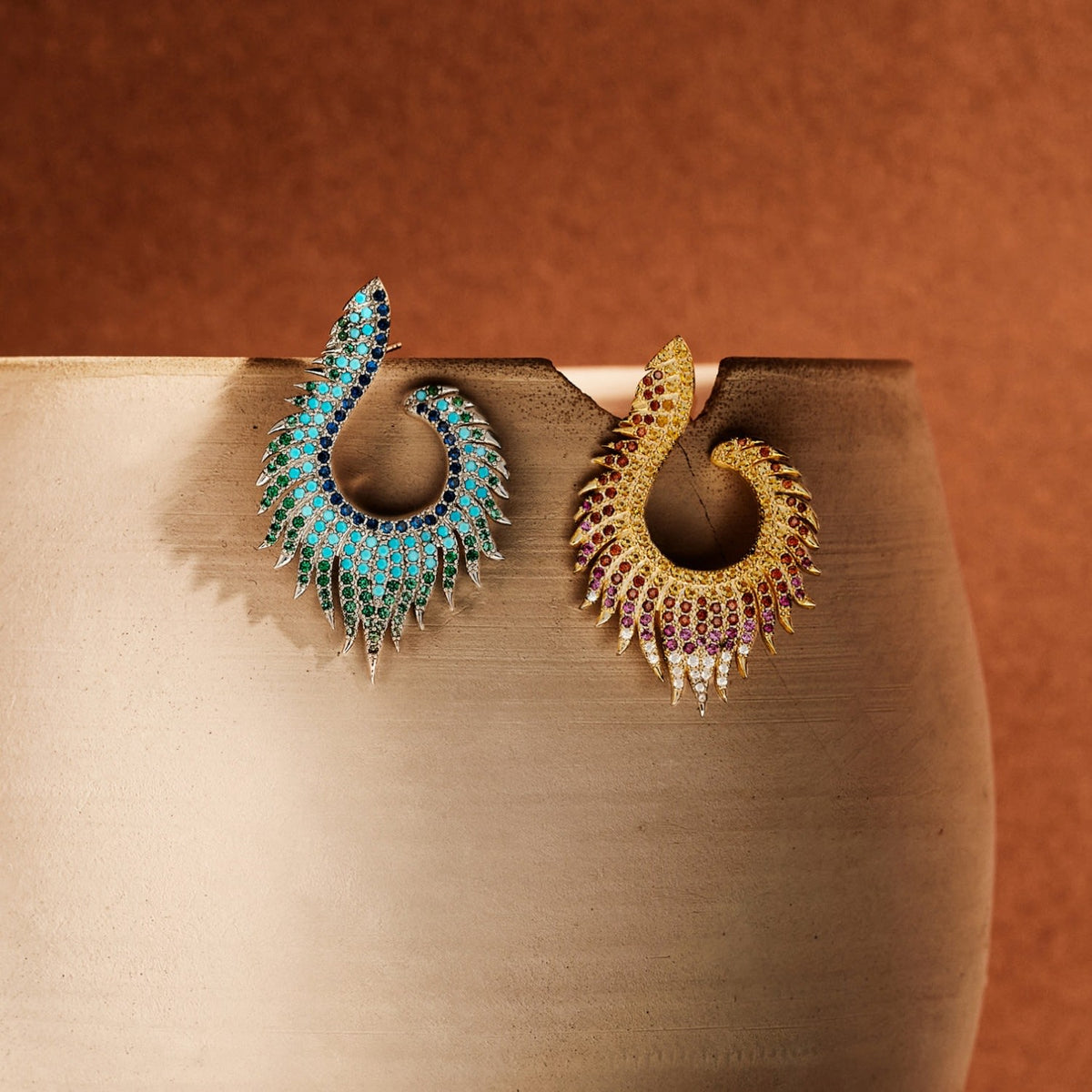 These earrings are handcrafted from 925 sterling silver, dipped in 18ct gold. They are set with micro pave AAA grade cubic zirconia in various colors.