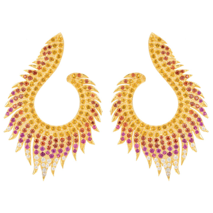 The Flame Earrings Golden Fire Gold by Latelita are a stunning statement piece. The flame-inspired design is adorned with cubic zirconia in hot shades of orange, pink, and yellow. These earrings are handcrafted in sterling silver and dipped in 18k gold, making them a perfect finishing touch for any evening or bridal outfit.
