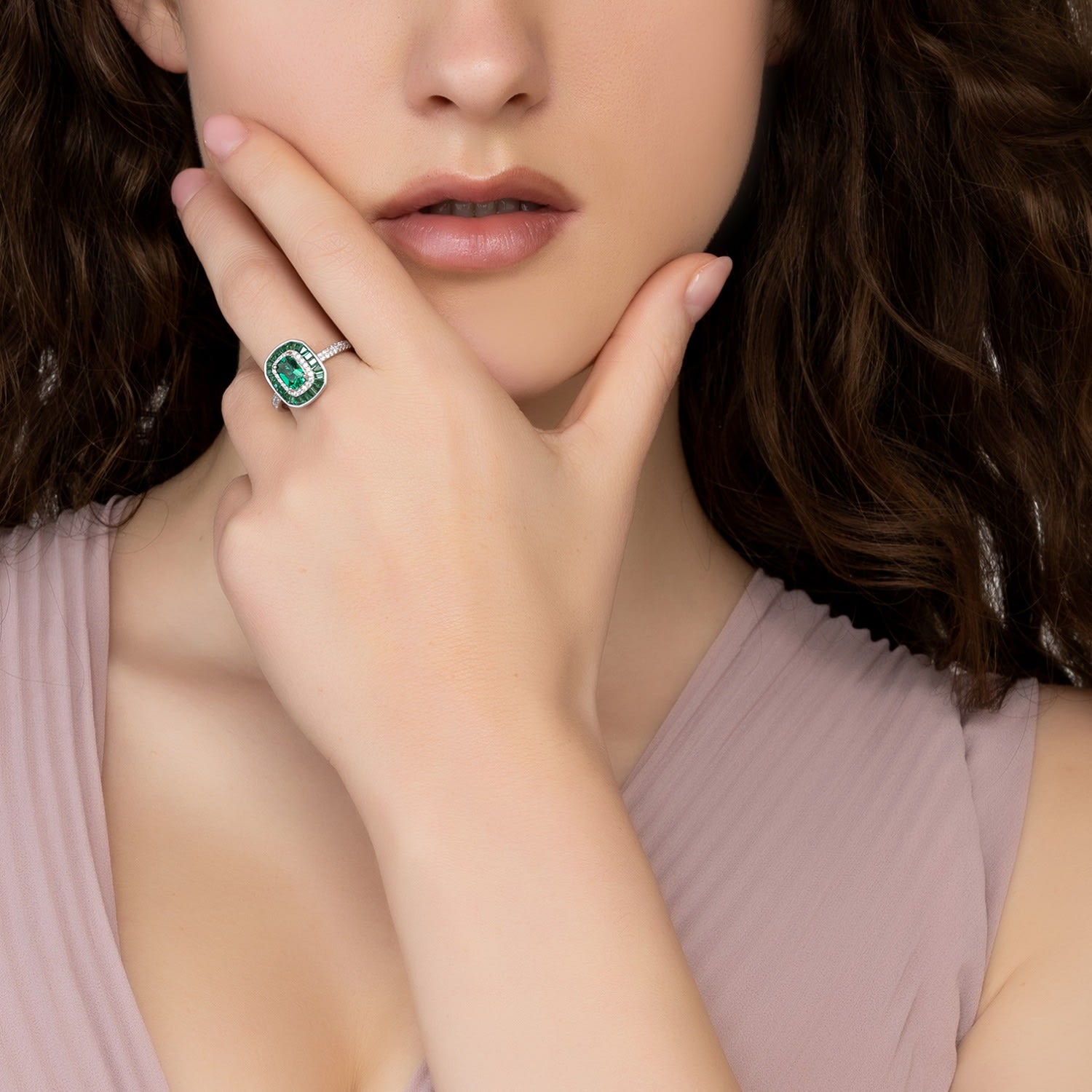 This cocktail ring is handcrafted from 925 sterling silver and is set with a lab-created emerald and cubic zirconia.