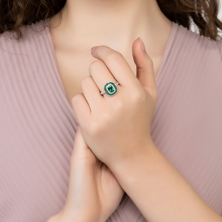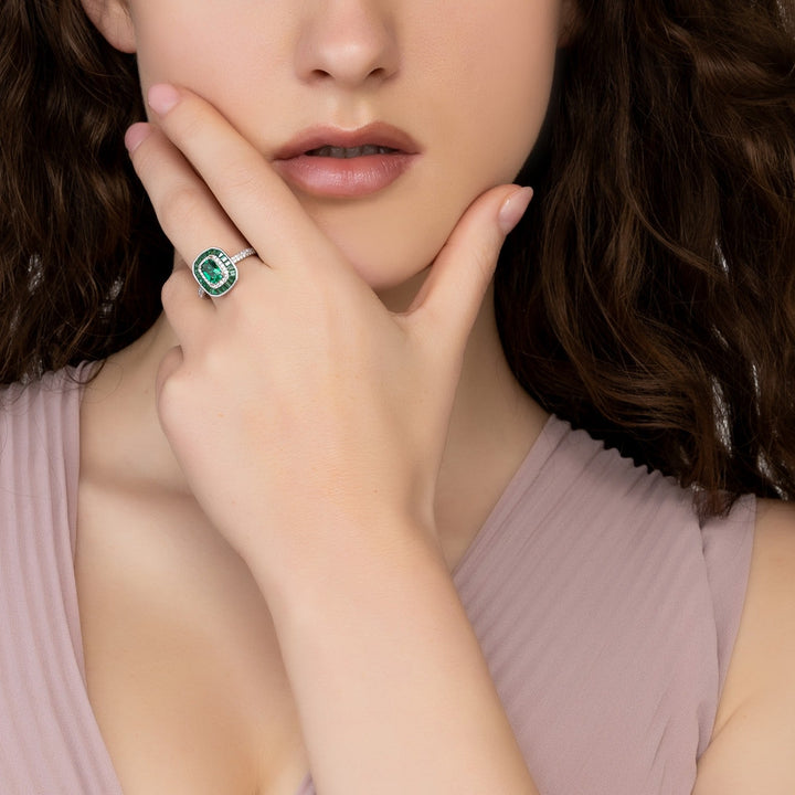 The Great Gatsby Cocktail Ring Emerald Silver by Latelita is a glamorous and sophisticated statement piece. Handcrafted in 925 sterling silver, this showstopper ring features a lab-created emerald centerpiece in a dazzling rectangle cut. The emerald is surrounded by a halo of cubic zirconia, with more stones on the narrow band, capturing the essence of the Roaring Twenties.