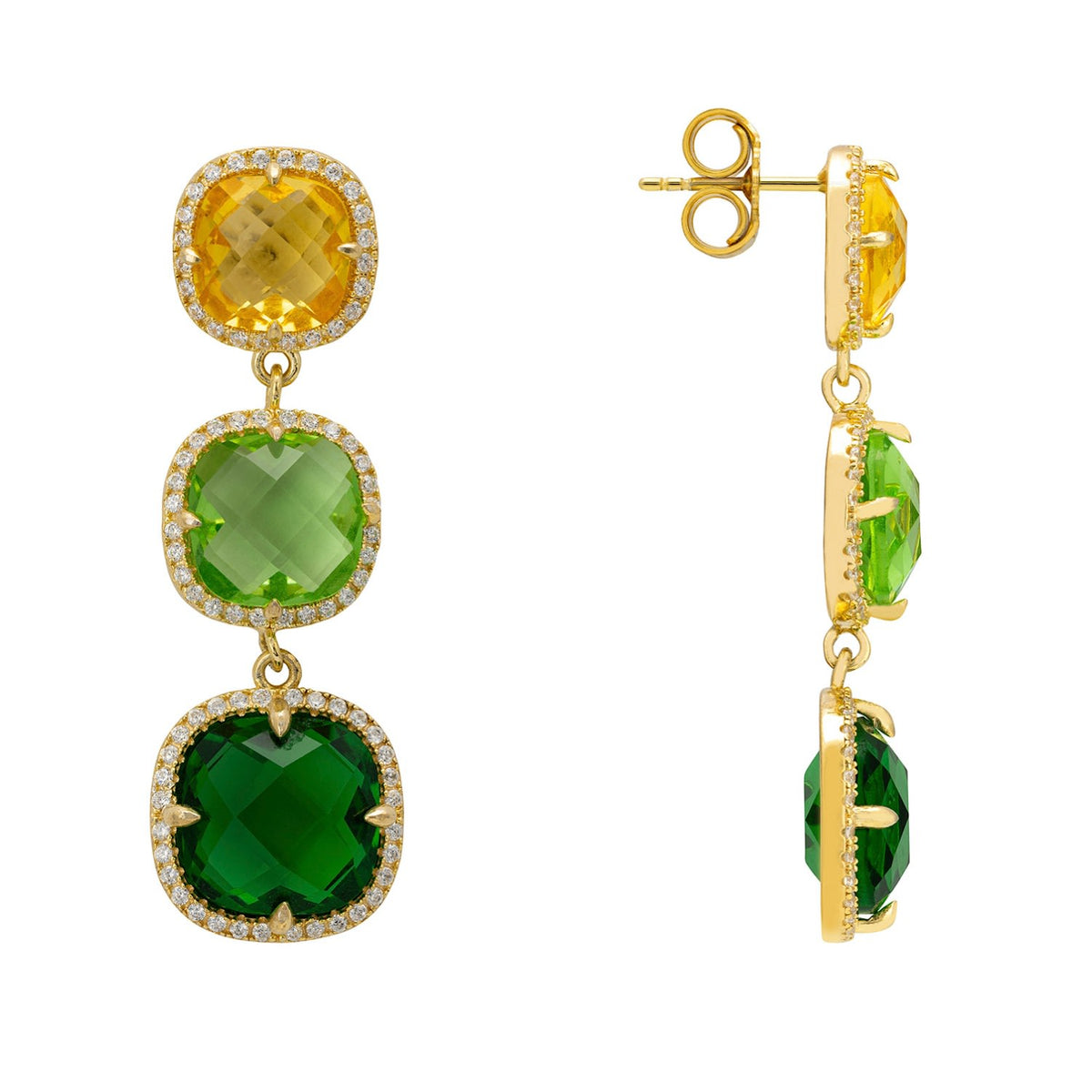 These handcrafted earrings are made from 925 sterling silver dipped in 18ct gold, featuring lab-grown emerald, peridot, and citrine stones, and cubic zirconia.