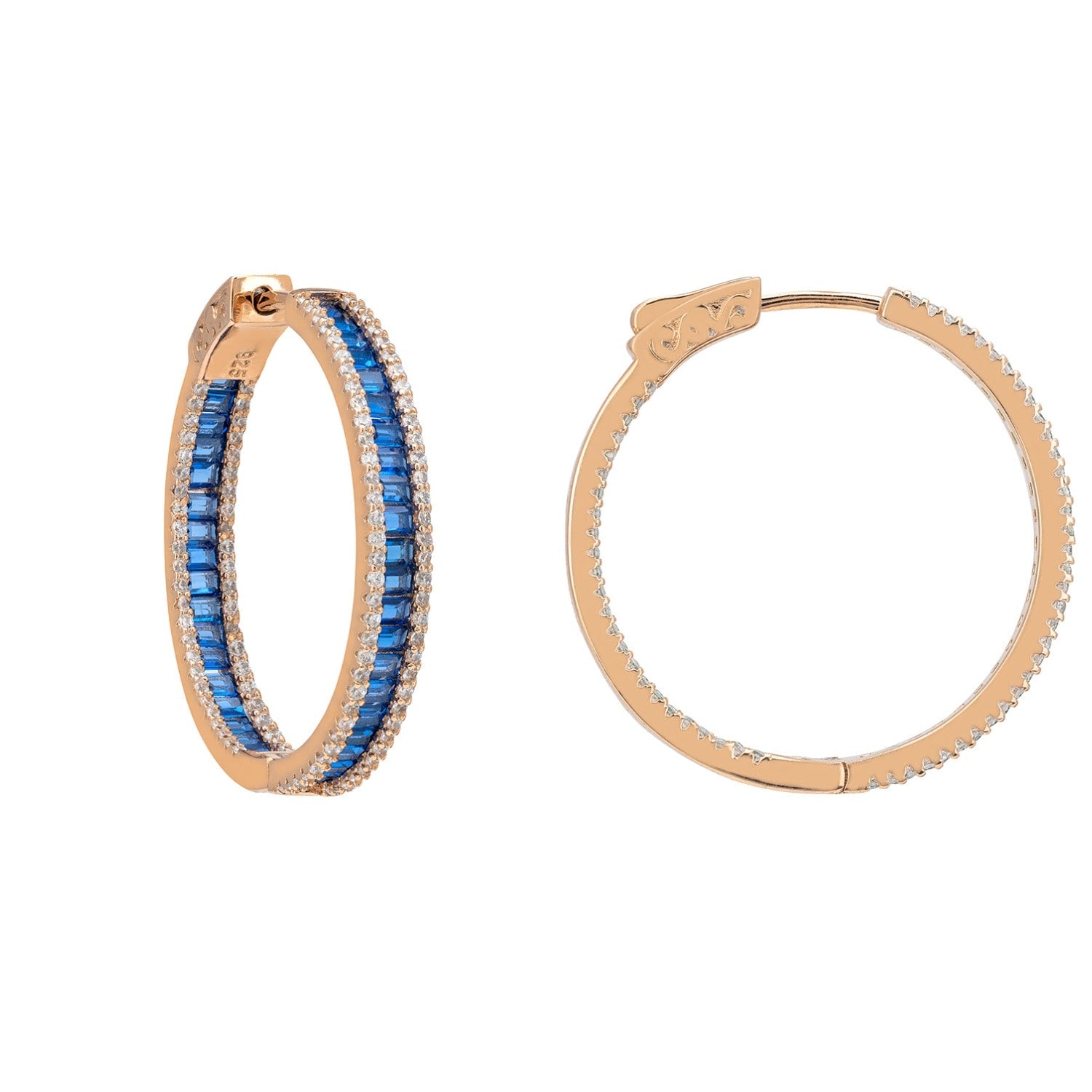 These hoop earrings are handcrafted from 925 sterling silver dipped in 18-karat rose gold. They are set with sapphire blue and white baguette-cut cubic zirconia.