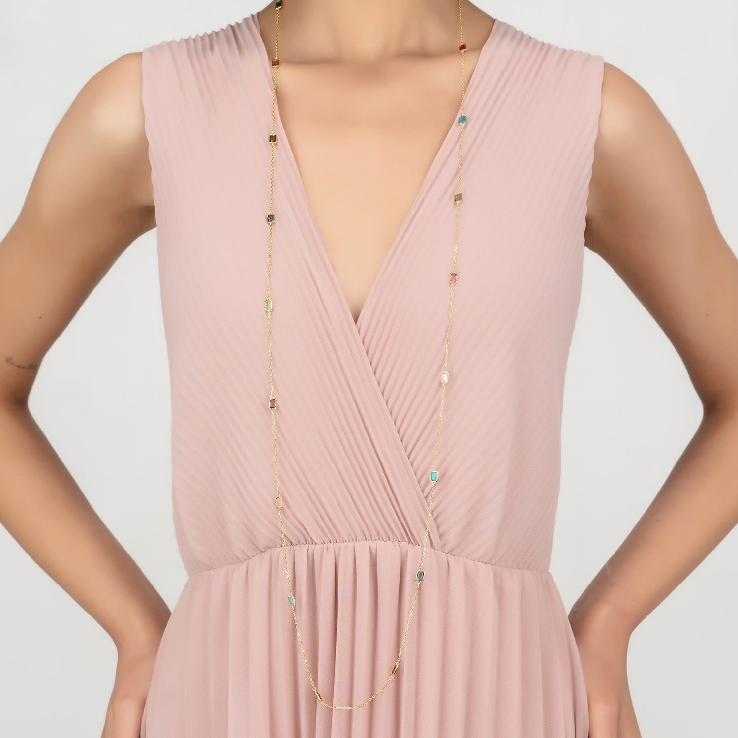 The Venice Rainbow 120Cm Necklace Gold by Latelita is a delicate and versatile chain necklace. It features rectangular-cut cabochons of assorted multi-colored gemstones spaced on a long, fine chain. The necklace is 120cm long and can be worn long or wrapped twice for a shorter, layered look. It is made of 925 sterling silver dipped in 18-karat gold.